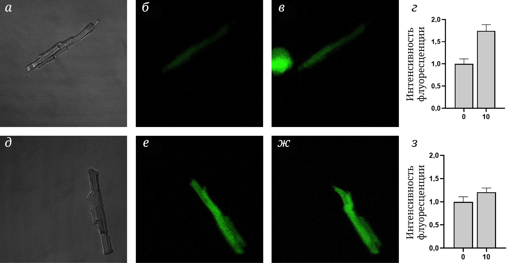 Рис. 1. Кардиомиоцит левого желудочка крысы, окрашенный Leadmium Green, в светлопольном режиме (а), на 0-й (б) и 10-й минуте (в) обработки PbCl2 во флуоресцентном режиме; нормированная интенсивность флуоресценции на 0-й и 10-й минуте обработки PbCl2 (г), данные представлены как среднее ± стандартное отклонение. Кардиомиоцит левого желудочка крысы, окрашенный Leadmium Green, в светлопольном режиме (д), на 0-й (е) и 10-й минуте (ж) обработки CdCl2 во флуоресцентном режиме; нормированная интенсивность флуоресценции на 0-й и 10-й минуте обработки CdCl2 (з), данные представлены как среднее ± стандартное отклонение