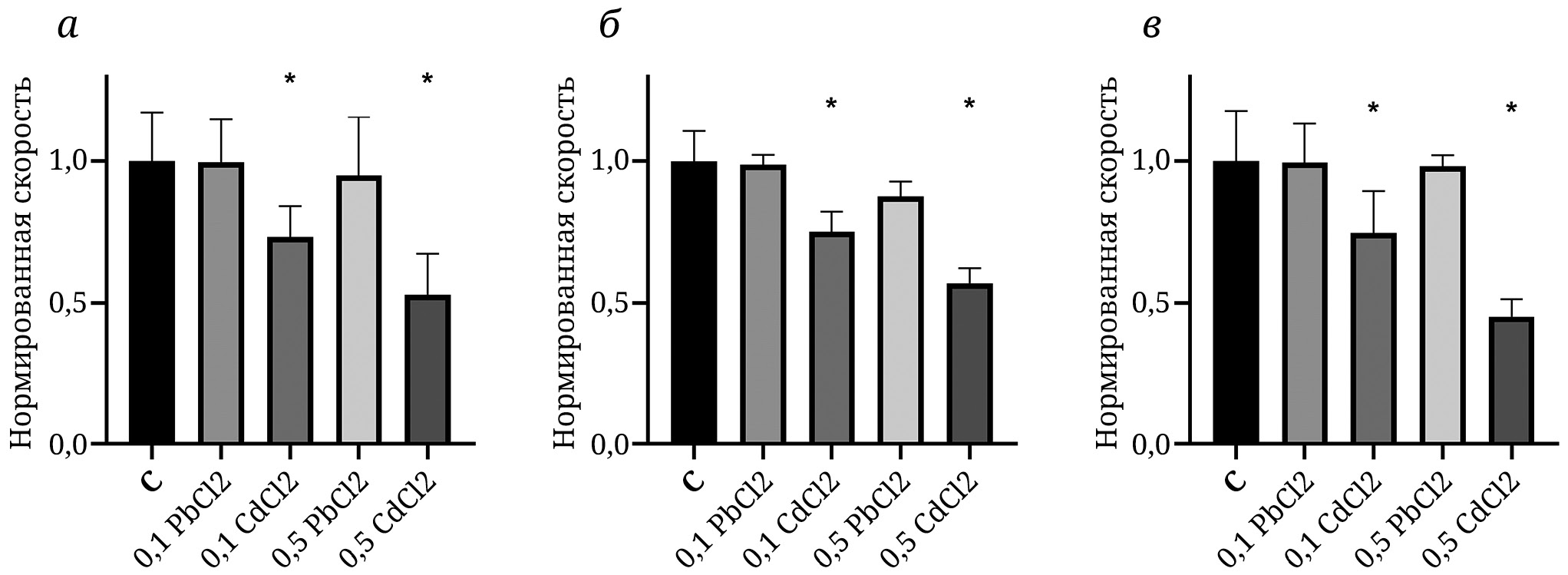 Рис. 4. Нормированная скорость скольжения актина по миозину предсердий (а), правого (б) и левого (в) желудочка свиньи в присутствии 0,1 мМ и 0,5 мМ PbCl2 или CdCl2. * Статистически значимые отличия от контрольной группы (p < 0,05)