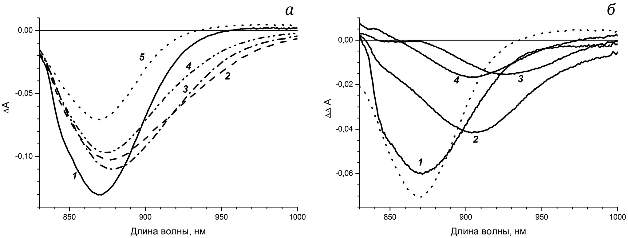 Рис. 1. Дифференциальные спектры поглощения РЦ Rba. Sphaeroides (а) на задержках времени 40 фс (кривая 1), 180 фс (кривая 2), 300 фс (кривая 3), 1,5 пс (кривая 4) и 210 пс (кривая 5), измеренные при температуре 293 К. б – Дважды дифференциальные спектры поглощения, полученные вычитанием спектров на задержках времени: 40 фс минус 210 пс (кривая 1), 1,5 пс минус 210 пс (кривая 2), 180 фс минус 1,5 пс (кривая 3) и 300 фс минус 1,5 пс (кривая 4); пунктиром показан спектр ∆А, измеренный на задержке времени 210 пс