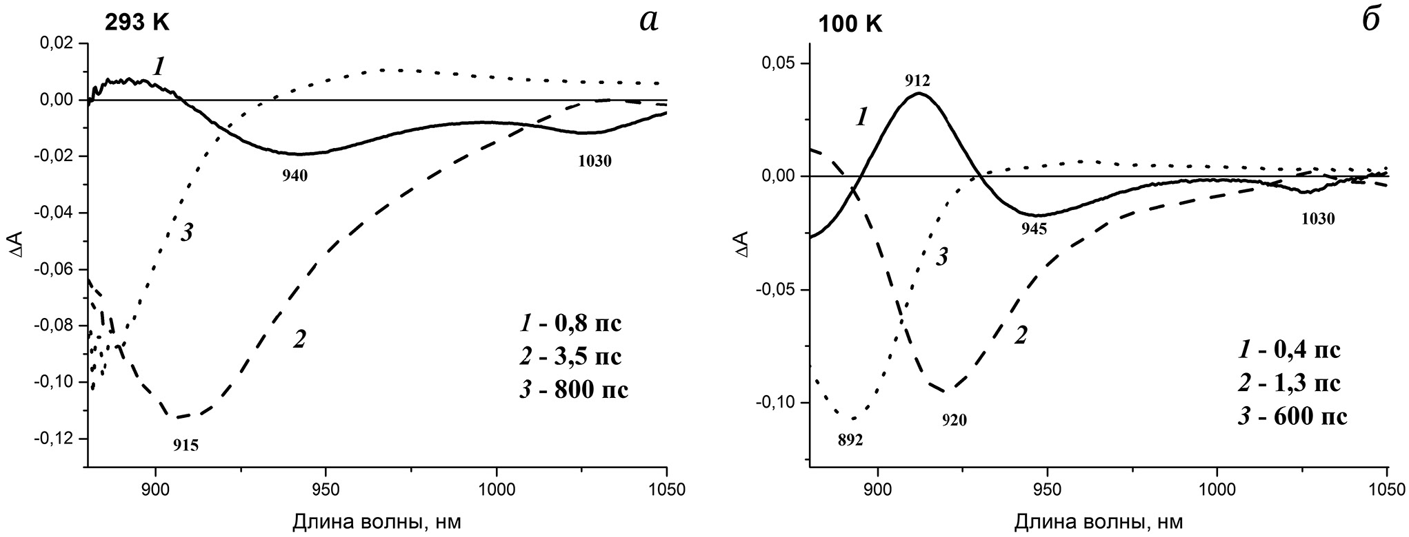 Рис. 4. Дифференциальные спектры поглощения РЦ Rba. sphaeroides, связанные с экспоненциальным затуханием (decay-associated difference spectra, DADS), измеренные при физиологической температуре (а) и при температуре 100 К (б)