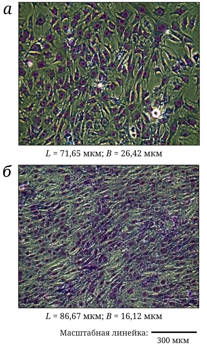 Рис. 8. Клетки С2С12 до дифференцировки (а) и при стимуляции миогенеза добавлением 100 мкМ сукцината (б). Фазово-контрастная микроскопия; 200×. Окрашивание ядер по Романовскому–Гимзе; L – длина миобластов, B – ширина миобластов