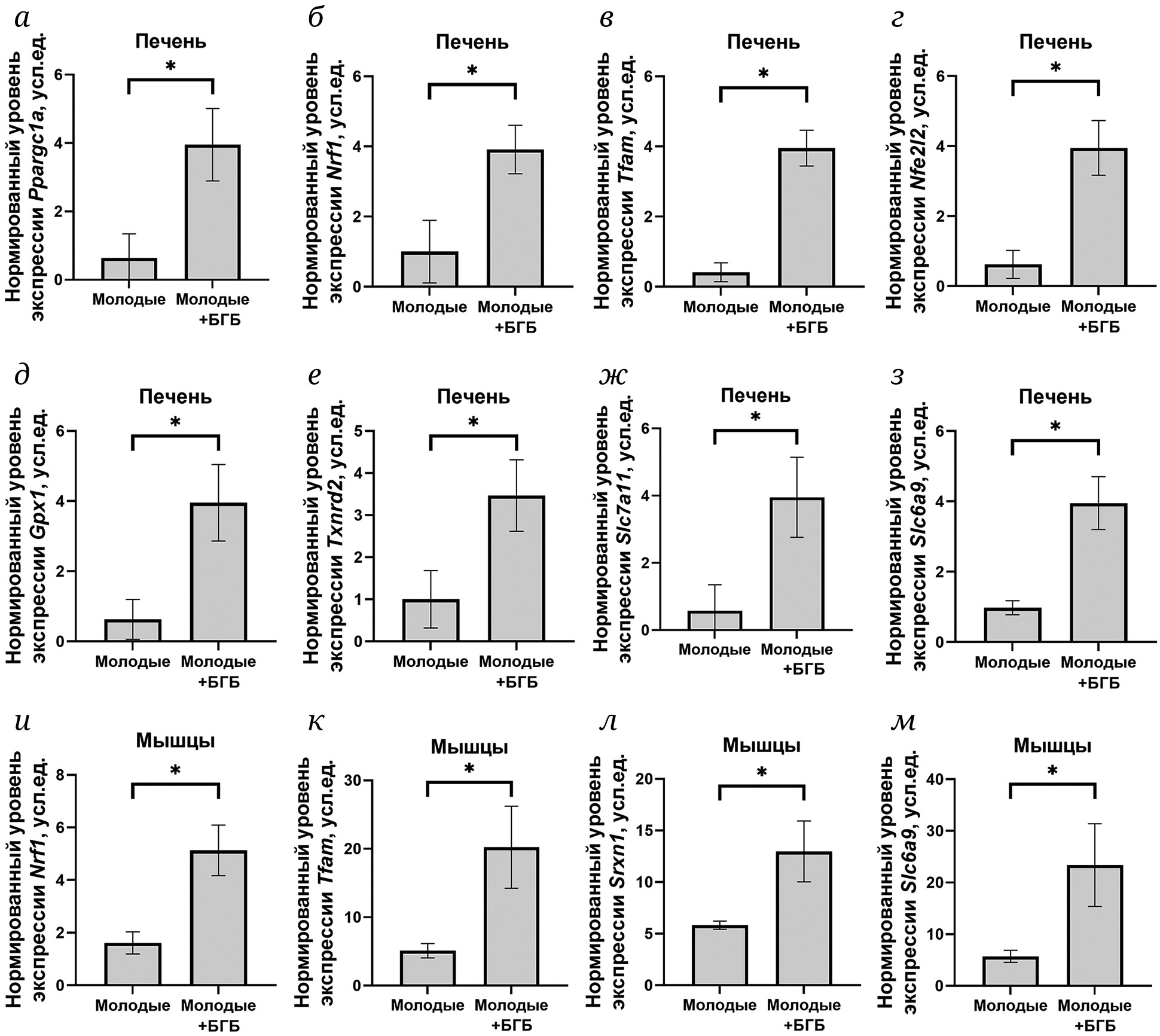 Рис. 2. Влияние подкожного введения БГБ в течение 2 недель на ткани молодых крыс. Влияние БГБ на экспрессию белков, отвечающих за биогенез митохондрий и антиоксидантную систему, в ткани печени (а–з) и мышц (и–м). Результаты представлены в виде средних значений ± ошибка среднего. Достоверность различий между группами: * р < 0,05 (t-критерий)