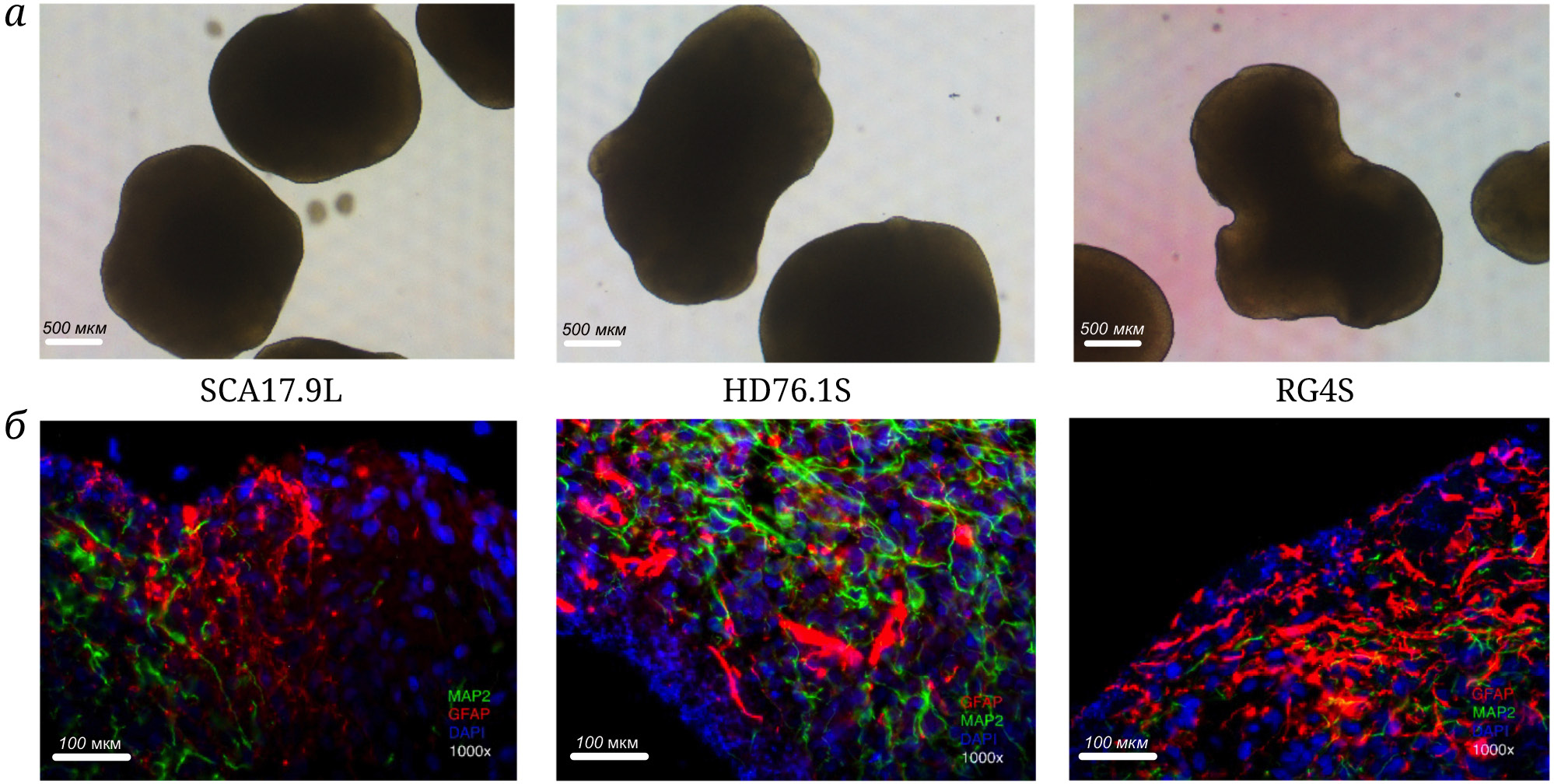 Рис. 1. Характеристики органоидов среднего мозга. а – Микрофотографии органоидов мозга с зонами морфогенеза после культивирования в среде для дифференцировки в миниреакторах в течение 45 дней; фазово-контрастная микроскопия (увеличение – 200×). б – Иммунофлуоресцентное окрашивание срезов органоидов мозга, полученных из дифференцированных производных различных линий ИПСК. Окраска антителами на MAP (зеленый); окраска антителами GFAP (красный). Ядра клеток окрашены DAPI (синий); увеличение – 1000×. SCA17.9L – клеточная линия, содержащая 45 CAG-повторов в TBP; HD76.1S – клеточная линия, содержащая 76 CAG-повторов в HTT; RG4S – контрольная клеточная линия