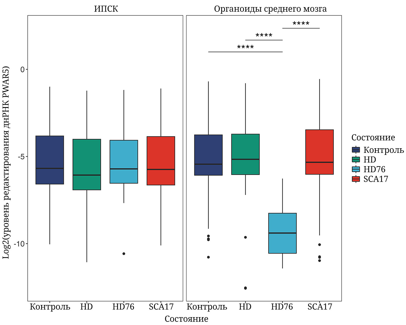В совокупности эти данные подтверждают представление о том, что после дифференцировки ИСПК в органоиды мозга значимо меняется профиль редактирования РНК [65]. Также отметим значительное снижение уровня редактирования РНК в органоидах среднего мозга от пациента с 76 CAG-повторами в гене HTT.