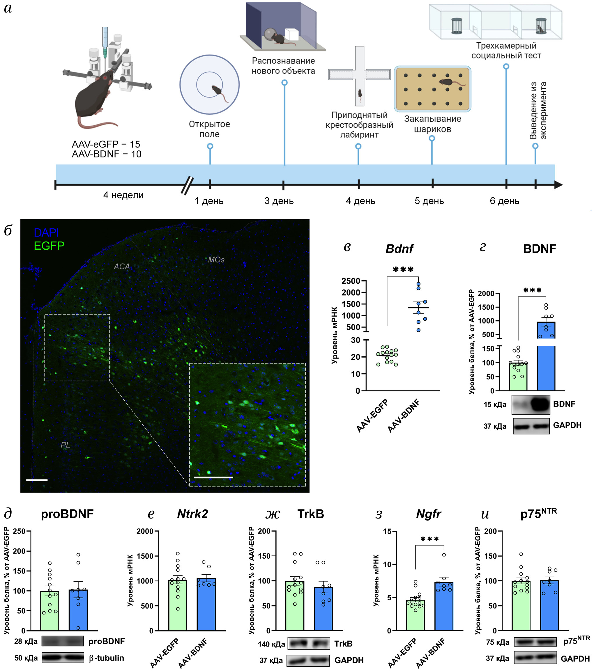 Рис. 1. Индукция сверхэкспрессии BDNF в гиппокампе мышей BTBR. а – Дизайн эксперимента. б – Репрезентативная микрофотография среза мозга мышей линии BTBR после инъекции AAV-EGFP. Видны области фронтальной коры и отдельные нейроны, экпрессирующие зелёный флуоресцентный белок. Размерная шкала – 50 мкм. ACA – область опоясывающей коры; PL – прелимбическая область; Mos – вторичная моторная область. в – Уровень экспрессии гена Bdnf; г – уровень белка зрелой формы BDNF; д – уровень белка проформы BDNF во фронтальной коре мышей BTBR, получивших инъекцию AAV-EGFP и AAV-BDNF. Уровень экспрессии рецепторов к BDNF: Ntrk2 (е) и Ngfr (з), и уровни соответствующих белков TrkB (ж) и p75NTR (и) во фронтальной коре мышей линии BTBR после инъекции AAV-EGFP и AAV-BDNF. Уровни мРНК (б, д и ж) представлены как число копий кДНК целевого гена, отнесённое на 100 копиям кДНК rPol2. На графиках (в, г, е и з) приведены количественная оценка интенсивности хемилюминесцентного сигнала и результат иммуноблота на мембране. Уровни белка представлены в относительных единицах, нормализованных на уровень соответствующего GAPDH и представлены как процент от контроля. Данные представлены как m ± SEM. *** p <0,001 – для группы AAV-BDNF относительно группы AAV-EGFP
