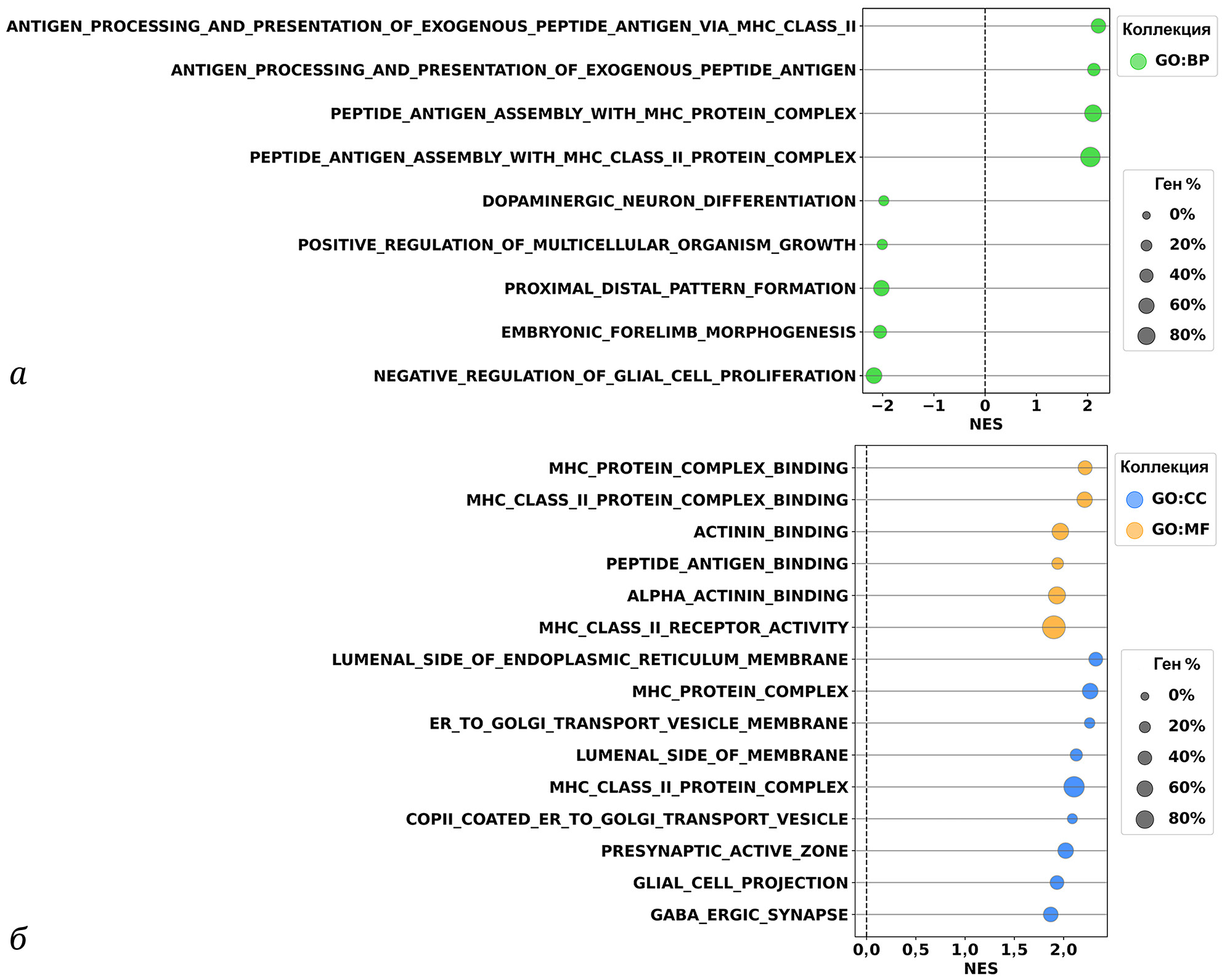 Рис. 1. Сравнительный анализ наборов генов GSEA в клетках U87MG относительно T98G. Результаты GSEA: a – для коллекций GO:BP; б – для GO:CC и GO:MF. Диаметр круга пропорционален количеству генов с разным уровнем экспрессии по сравнению с общим количеством генов в наборе. NES – нормализованный показатель обогащения. FDR ≤ 0,05