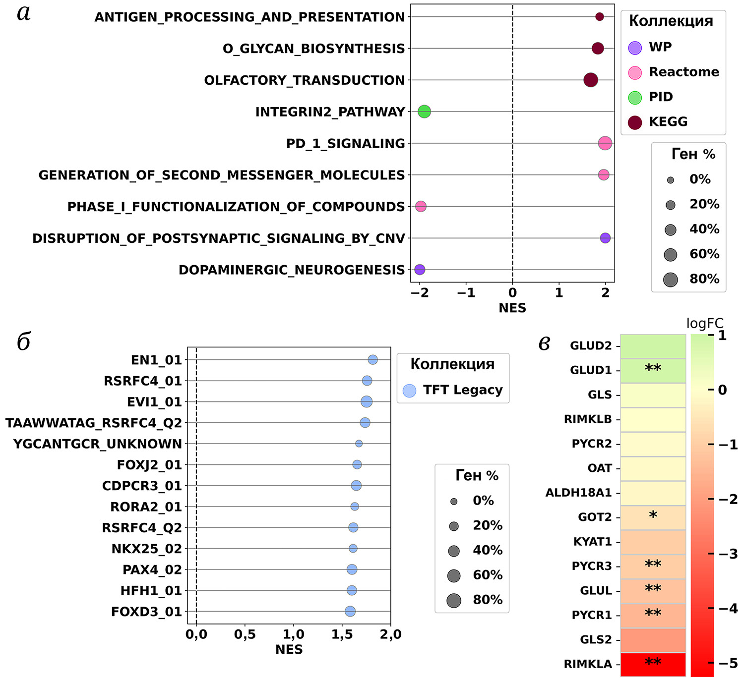 Рис. 2. Сравнительный анализ наборов генов GSEA в клетках U87MG относительно T98G. Результаты GSEA: а – для коллекций KEGG, PID, Reactome, WP; б – TFT Legacy. Диаметр круга пропорционален количеству генов с разным уровнем экспрессии по сравнению с общим количеством генов в наборе. NES – нормализованный показатель обогащения. FDR ≤ 0,05. в – Кратность изменения экспрессии генов, ассоциированных с метаболизмом глутамина, из базы данных Reactome Glutamate and Glutamine Metabolism в культуре клеток U87MG относительно T98G (logFC). * FDR ≤ 0,05, ** FDR ≤ 0,01