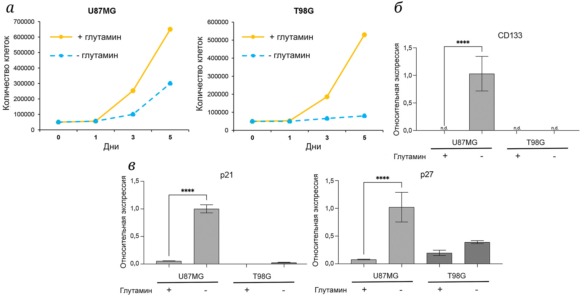 Рис. 3. Влияние депривации глутамина на линии клеток U87MG и T98G. а – Скорость роста клеток U87MG и T98G в отсутствие либо в присутствии глутамина. Изменение уровней экспрессии на уровне мРНК, определённое методом ПЦР в реальном времени: б – CD133, в – р21Waf1 и р27KIP1. **** р < 0,005