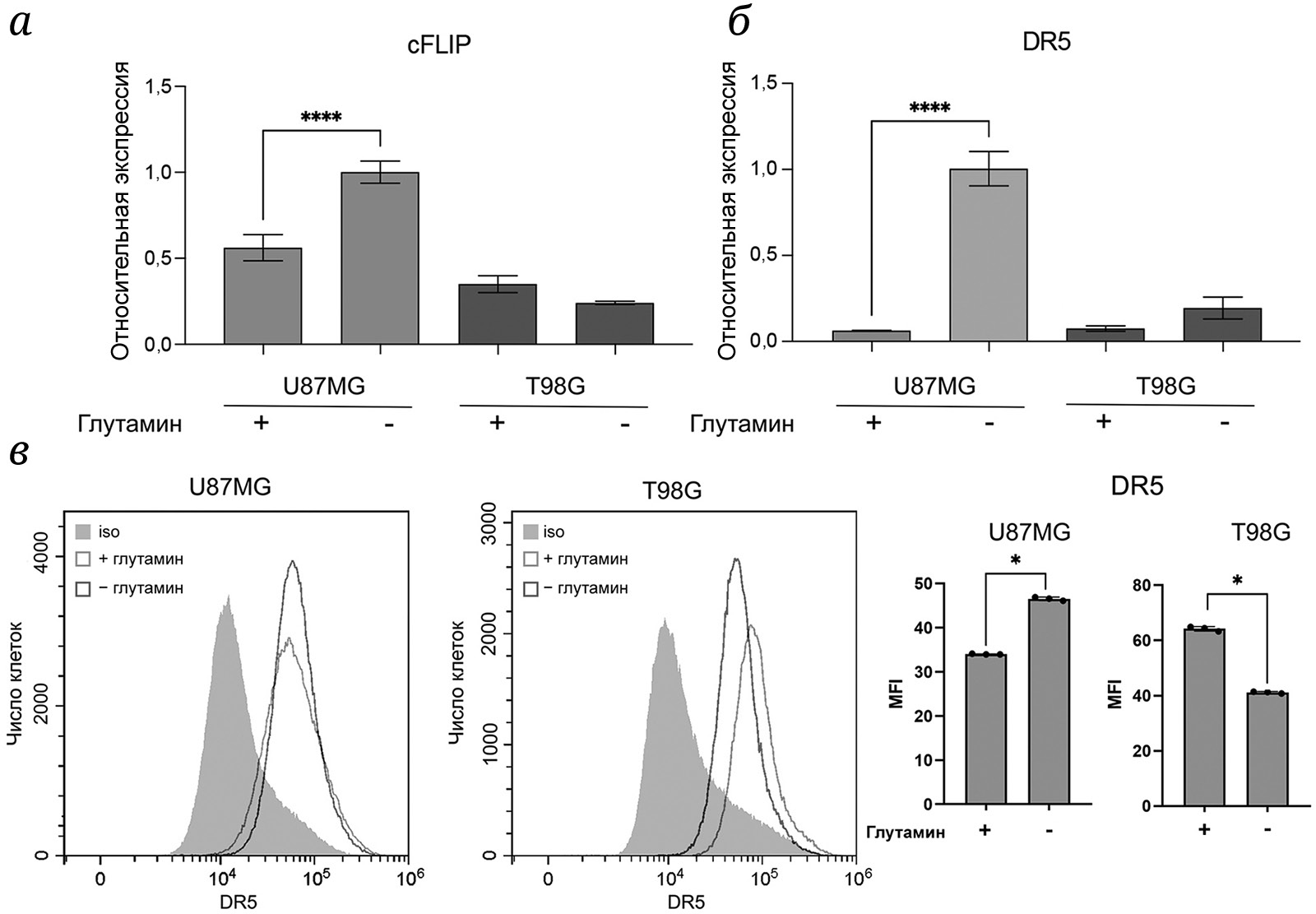 Рис. 5. Исследование экспрессии DR5 и cFLIP в линиях клеток U87MG и T98G. а – Экспрессия cFLIP; б – экспрессия DR5 на уровне мРНК, **** р < 0,005. в – Экспрессия DR5 на поверхности клеток, * р < 0,05. MFI – средняя интенсивность флуоресценции