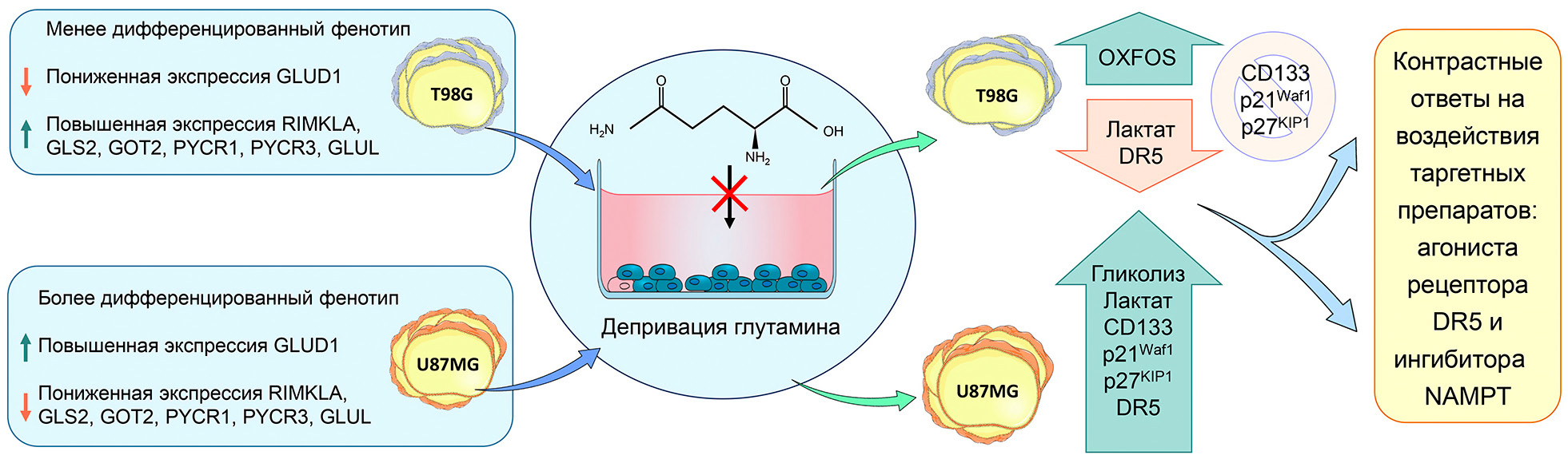 Рис. 7. Схематическое изображение противоположных эффектов, наблюдаемых в клеточных линиях глиобластомы человека U87MG и T98G при депривации глутамина