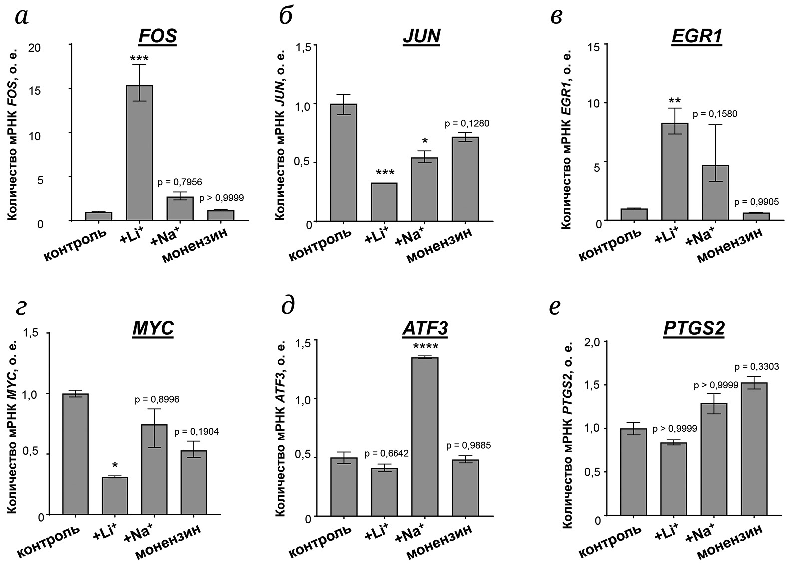 Для сравнения влияния ионов Li+ и Na+ на транскрипцию генов FOS, JUN, EGR1, ATF3, MYC и PTGS2 в HUVEC клетки инкубировали в среде, содержащей LiCl, или в контрольной среде, содержащей Na+-ионофор монензин. Для контроля осмолярности внеклеточной среды использовали NaCl в концентрации, эквимолярной LiCl.