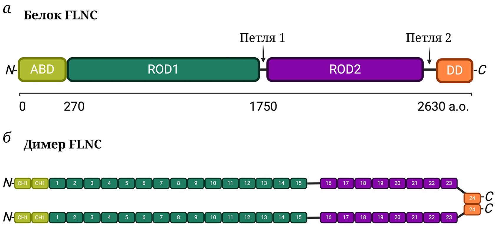 Рис. 1. Cтруктура полипептидной цепи FLNC. а – Схема строения мономера FLNC: N-концевой актин-связывающий (ABD) участок (обозначен салатовым цветом), стержневые участки ROD1 (обозначен зеленым цветом) и ROD2 (обозначен фиолетовым цветом), С-концевой домен димеризации (DD, dimerization domain) (обозначен оранжевым цветом), петлевые домены (петля 1, петля 2); a.o. – аминокислотные остатки. б – Схема строения димера FLNC: кальпонин-гомологичные домены 1 и 2 (СН1, СН2) в составе ABD-участка; иммуноглобулин-подобные домены 1–15 в составе ROD1-участка; иммуноглобулин-подобные домены 16–23 в составе ROD2-участка; иммуноглобулин-подобный домен 24 в составе домена димеризации. Рисунок создан в BioRender