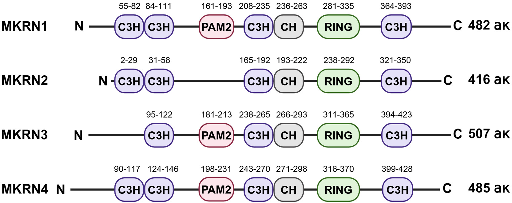 Структура MKRN включает несколько доменов цинковых пальцев типа C3H, домен, подобный PAM2, домен RING-пальца и цистидин-гистидиновый (CH) домен [2, 19, 20] (рис. 1). Цинковые пальцы типа C3H (ассоциированные с РНК-связывающей функцией) встречаются в различных рибонуклеопротеинах, участвующих в процессинге РНК, включая сплайсинг, определении локализации мРНК и трансляции [21, 22]. Домен, подобный PAM2 (PCI/PINT-ассоциированный модуль 2), служит для облегчения взаимодействия MKRN с поли(А)-связывающими белками (PABP) путём, независимым от РНК [20]. MKRN1, MKRN3 и MKRN4 обладают этим доменом [20, 23], однако для MKRN2 также наблюдается взаимодействие с PABP [24]. Цинк-связывающий домен, называемый RING (Really Interesting New Gene), отвечает за связывание убиквитинлигазы E2 с убиквитином и стимулирует его перенос [25]. Функция домена, богатого остатками цистеина и гистидина, до сих пор неизвестна [2]. Белки MKRN1, MKRN2 и MKRN4 у человека имеют 4 цинковых пальца типа C3H, в то время как у MKRN3 их 3 [1].
