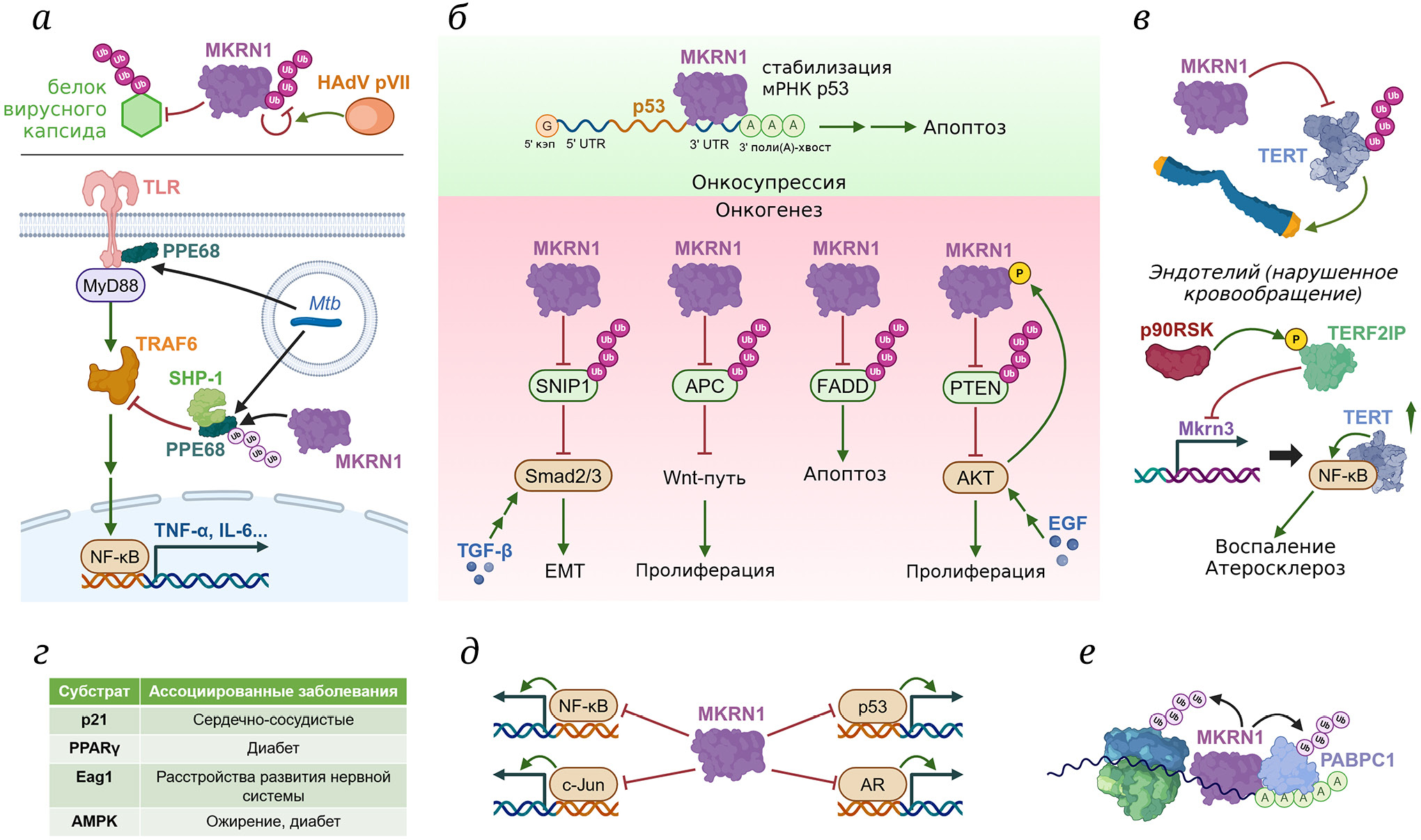 Рис. 2. Разнообразие биологических функций MKRN1. а – MKRN1 участвует в противовирусной защите, но способствует подавлению иммунного ответа при микобактериальной инфекции; TLR – toll-подобные рецепторы; TRAF6 – фактор 6, ассоциированный с рецептором TNF; SHP-1 – фосфатаза-1, содержащая домен, гомологичный Src 2; Mtb – Mycobacterium tuberculosis; б – MKRN1 оказывает различные эффекты на онкогенез; EMT – эпителиально-мезенхимальный переход; в – MKRN1 регулирует уровни белка TERT; г – мишени опосредованного MKRN1 убиквитинилирования и связанные с ним заболевания; д – MKRN1 действует как транскрипционный репрессор; е – MKRN1 участвует в контроле качества трансляции посредством остановки рибосом