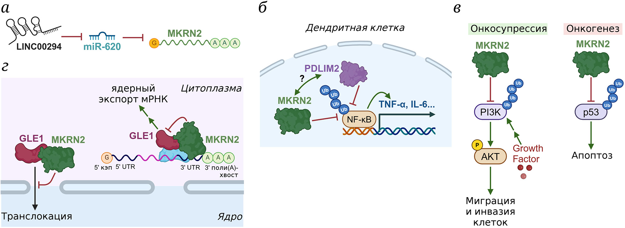 Рис. 3. Многообразие биологических функций MKRN2. а – Уровень экспрессии MKRN2 регулируется через отрицательную петлю с участием miR-620 и LINC00294; б – MKRN2 и PDLIM2 совместно ингибируют воспалительный ответ, подавляя трансактивацию ядерного фактора κB (NF-κB); в – различные действия MKRN2 на онкогенез; г – MKRN2 функционально антагонизирует GLE1 во время ядерного экспорта мРНК, возможно, за счёт предотвращения транслокации GLE1 в ядро