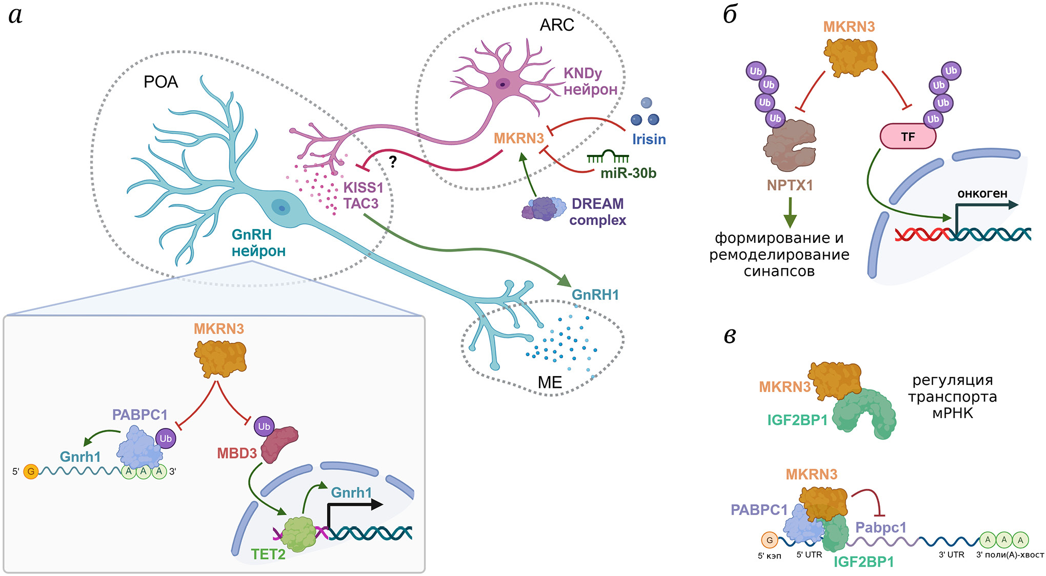 Было выдвинуто предположение о том, что MKRN3 регулирует уровни мРНК KISS1 и TAC3, ингибируя активность промоторов соответствующих генов путём прямого связывания с ними [64]. Этот эффект был продемонстрирован на клеточной линии HEK293T [64], однако доказательства способности MKRN3 проникать в ядра отсутствуют. Более вероятным представляется, что MKRN3 регулирует промоторы с помощью промежуточных белков, таких как белок, содержащий метил-CpG-связывающий домен (MBD3), который является мишенью убиквитинилирования MKRN3. MBD3 в комплексе с тета-метилцитозин диоксигеназой 2 (TET2) активирует промотор GnRH1 [80]. Было показано, что осуществляемое MKRN3 убиквитинилирование MBD3 нарушает его связывание с TET2 [80]. Это приводит к общему снижению содержания 5hmC в геномах млекопитающих и, в частности, к снижению активности промотора GnRH1 (рис. 4, а).