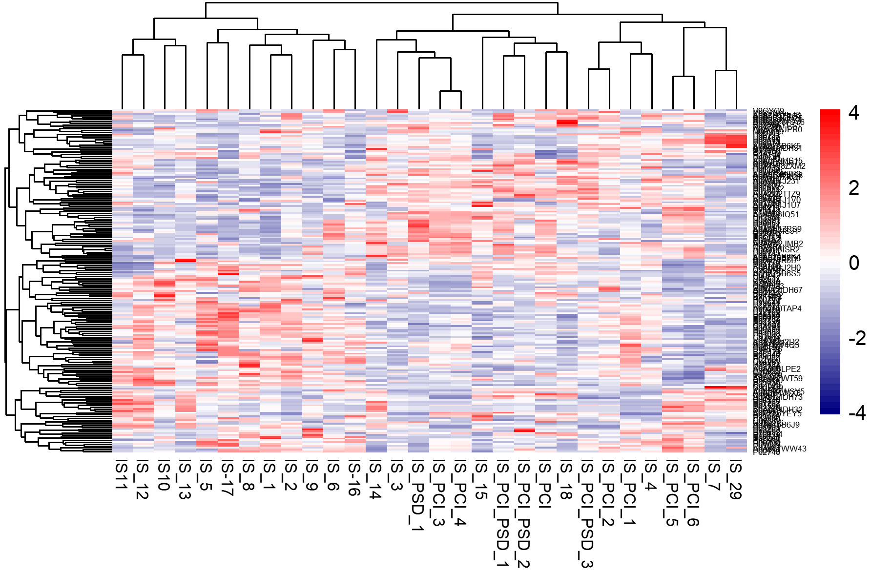 Количественный сравнительный анализ белков экзосом сыворотки крови пациентов с УКН и без УКН. На рис. 1 представлена тепловая карта, демонстрирующая результаты иерархической кластеризации белков и образцов пациентов с постинсультными УКН и без УКН. Иерархическая кластеризация привела к разделению выборок на основе белковых профилей пациентов с УКН и без УКН.