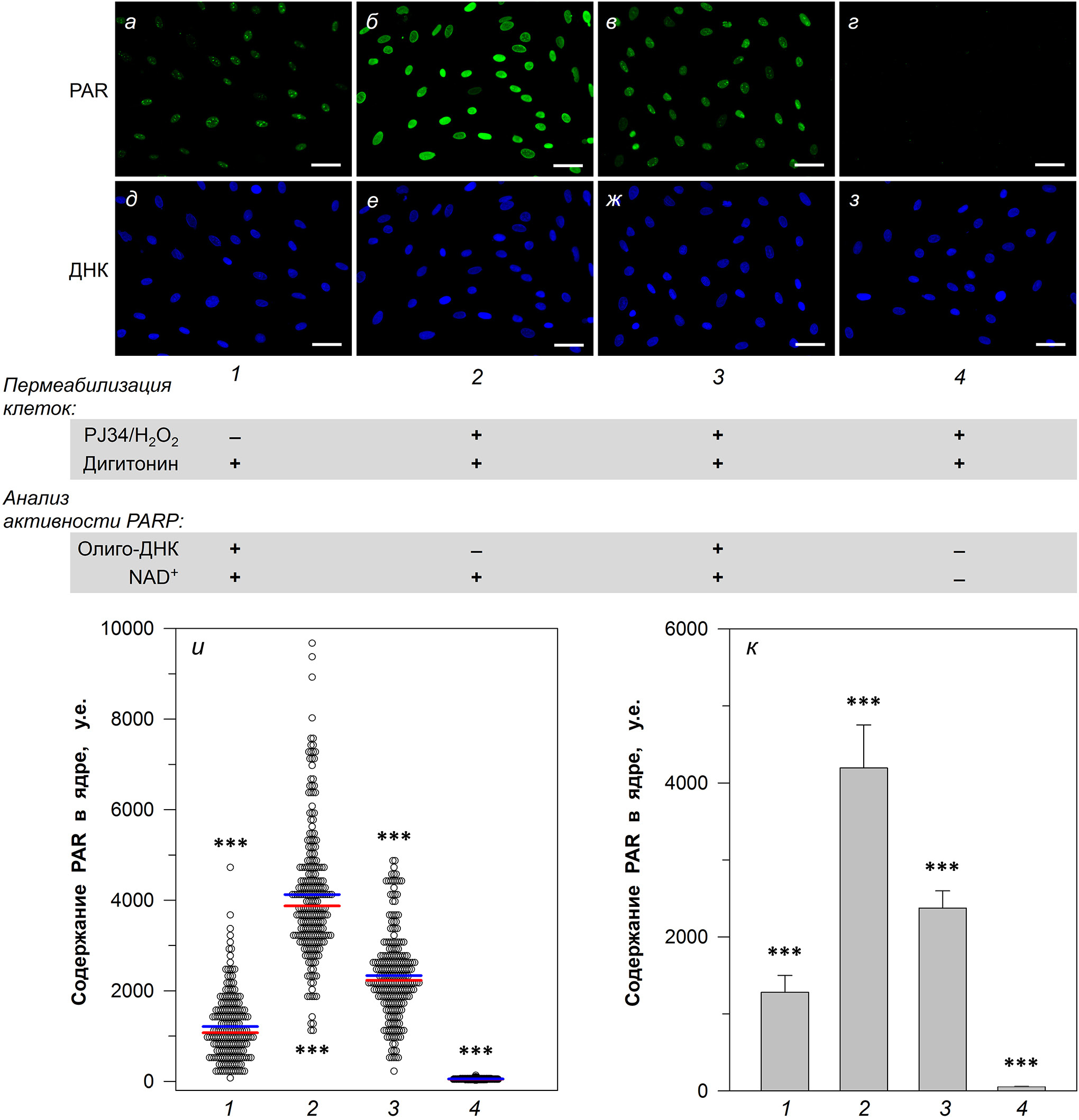 Рис. 2. Влияние предварительной обработки клеток PJ34 и H2O2 на активность PARP в пермеабилизованных дигитонином клетках Н9с2. а–з – Микрофлуоресцентный анализ содержания PAR в ядрах клеток (1–4 – различные варианты анализируемых препаратов). Длина масштабной планки соответствует 50 мкм. Объектив 20×. и – Результаты количественного анализа PAR в отдельных ядрах. Число проанализированных ядер: 198 (1), 236 (2), 229 (3), 144 (4). Средние и медианные значения отражены синей и красной линиями соответственно. к – Варьирование значений уровня PAR при анализе отдельных микрофлуоресцентных снимков разных препаратов (среднее ± стандартное отклонение; n = 6). Концентрации реагентов: PJ34 – 5 мкМ, H2O2 – 1 мМ, дигитонин – 35 мкМ, олиго-ДНК – 50 мкг/мл, NAD+ – 10 мкМ; время инкубации с H2O2 – 5 мин; время инкубации с NAD+ – 5 мин. *** p < 0,001 между всеми парами образцов (дисперсионный анализ ANOVA/апостериорный анализ Бонферрони)