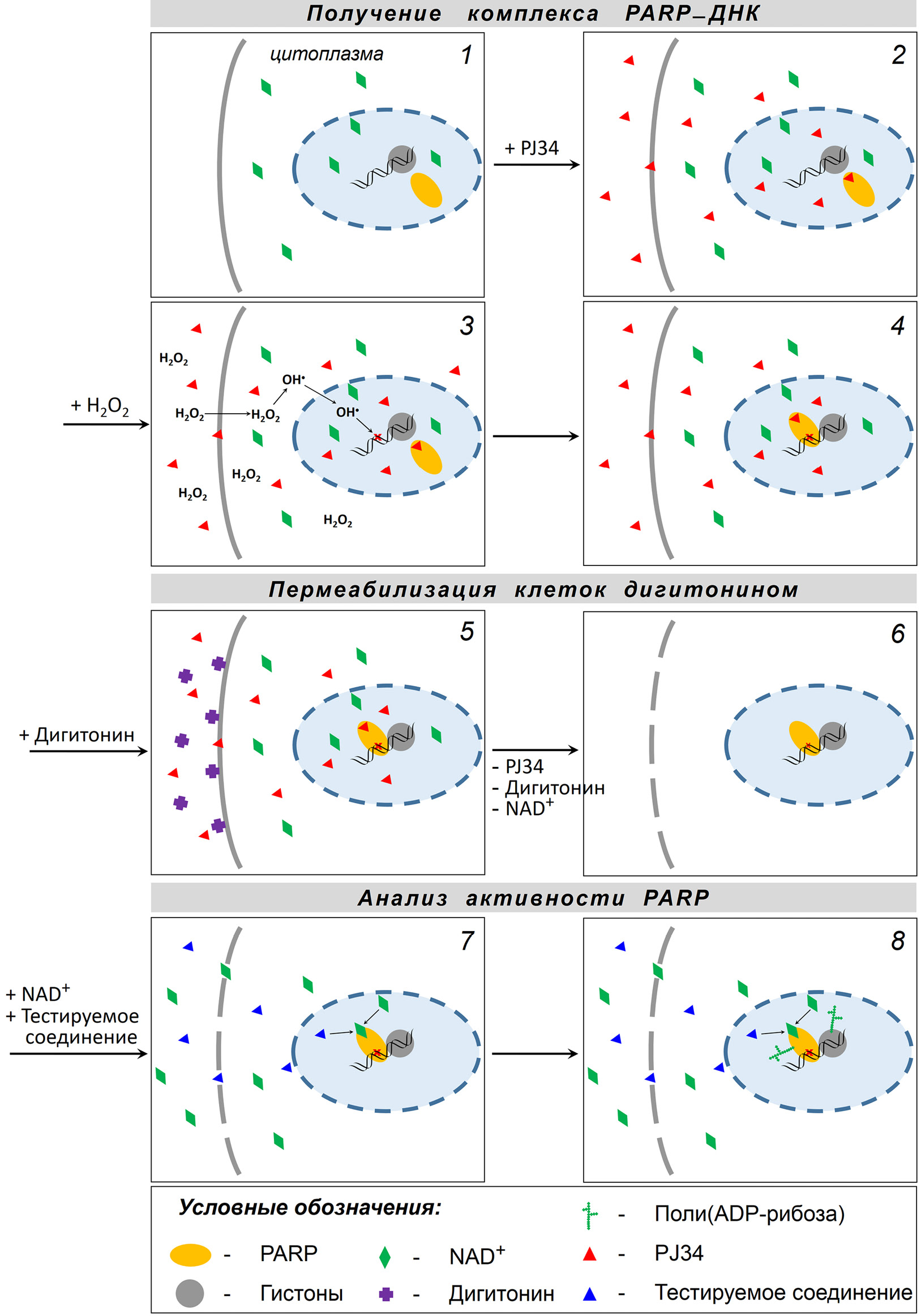 Рис. 3. Оптимизированная схема анализа активности PARP в пермеабилизованных адгезированных клетках. 1 – Адгезированные интактные клетки; 2 – преинкубация с PJ34 (5 мкМ, 1 ч, 37 °С, 5% СО2); 3 – обработка Н2О2 (1 мМ, 5 мин, 25 °С); 4 – образование комплекса PARP–ДНК; 5 – пермеабилизация дигитонином (35 мкМ, 5 мин, 0 °С); 6 – отмывка от дигитонина, PJ34 и эндогенного NAD+; 7 – инкубация пермеабилизованных клеток с экзогенным NAD+ (10 мкМ) и тестируемым соединением (2–10 мин, 25 °С); 8 – PARилирование белков