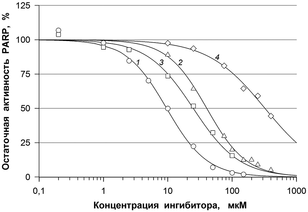 Оценка эффективности ингибирования PARP исследуемыми веществами производилась на основании значений уровня PAR в 1–2 тыс. ядер в трёх независимых образцах (сестринских культурах). Расчёт значений IC50 проводили с использованием программы SigmaPlot («Systat Software Inc.», США), как было описано ранее [31].