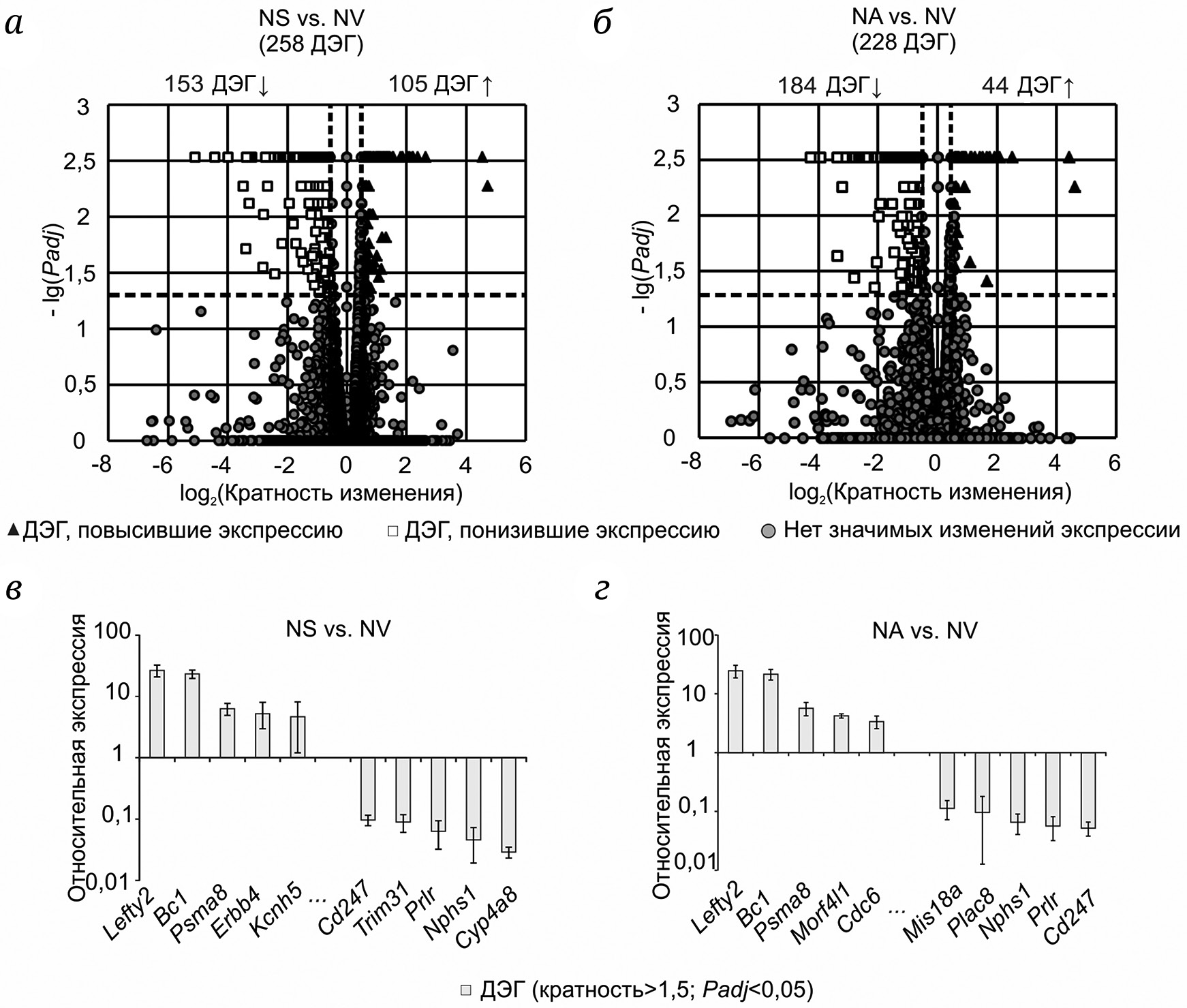 RNA-Seq-анализ влияния АКТГ-подобных пептидов на транскриптом участка фронтальной коры крыс. В результате RNA-Seq были получены данные об изменении уровня мРНК под действием семакса и АКТГ(6–9)PGP для 17 367 генов крысы. Графики «volcano-plot» иллюстрируют различия в экспрессии мРНК между группами NS относительно (vs.) NV (рис. 2, а) и NА vs. NV (рис. 2, б). Мы обнаружили 258 ДЭГ (кратность > 1,5; Padj < 0,05) под действием семакса в группе NS vs. NV. Из них 105 генов (Lefty2, Bc1, Psma8, Erbb4, Kcnh5 и др.) повысили уровень экспрессии и 153 гена понизили его (Cyp4a8, Nphs1, Prlr, Trim31, Cd247 и др.). Величины дифференциальной экспрессии перечисленных генов представлены на рис. 2, в. Также мы обнаружили 228 ДЭГ под действием АКТГ(6-9)PGP в группе NA vs. NV. Из них 44 гена, в том числе Lefty2, Bc1, Psma8, Morf4l1, Cdc6, повысили уровень экспрессии и 184 гена, включая Mis18a, Plac8, Nphs1, Prlr, Cd247, понизили его. Величины дифференциальной экспрессии перечисленных выше генов представлены на рис. 2, г.