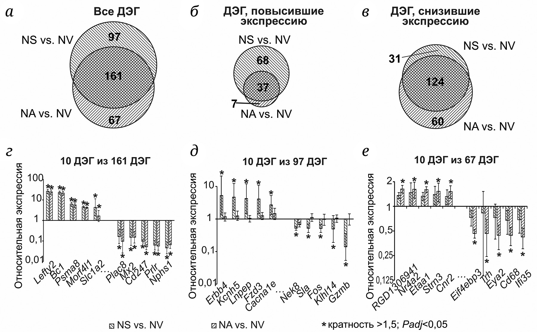 Рис. 3. Сравнение результатов RNA-Seq в экспериментах с введением семакса и АКТГ(6–9)PGP. Диаграммы Венна (а–в) иллюстрируют результаты, полученные для двух попарных сравнений «норма + семакс» (NS) vs. «норма + физраствор» (NV) и «норма + АКТГ(6–9)PGP» (NA) vs. «норма + физраствор» (NV): для всех ДЭГ (а), только для повысивших экспрессию (б) и только для понизивших экспрессию (в). Числа в пересечении различных наборов генов на диаграмме Венна указывают количество ДЭГ (кратность > 1,5; Padj < 0,05) по данным RNA-Seq. Показаны величины относительной экспрессии для 10 генов из каждого сегмента на диаграмме Венна (панель а): гены с наибольшим кратным изменением экспрессии в NS vs. NV и лежат в пределах пересечения наборов ДЭГ (г); ДЭГ с наибольшим кратным изменением экспрессии в NS vs. NV, но не являющиеся ДЭГ в NA vs. NV (д); ДЭГ с наибольшим кратным изменением экспрессии в NA vs. NV, но не являющиеся ДЭГ в NS vs. NV (е). Данные представлены как среднее ± стандартная ошибка среднего
