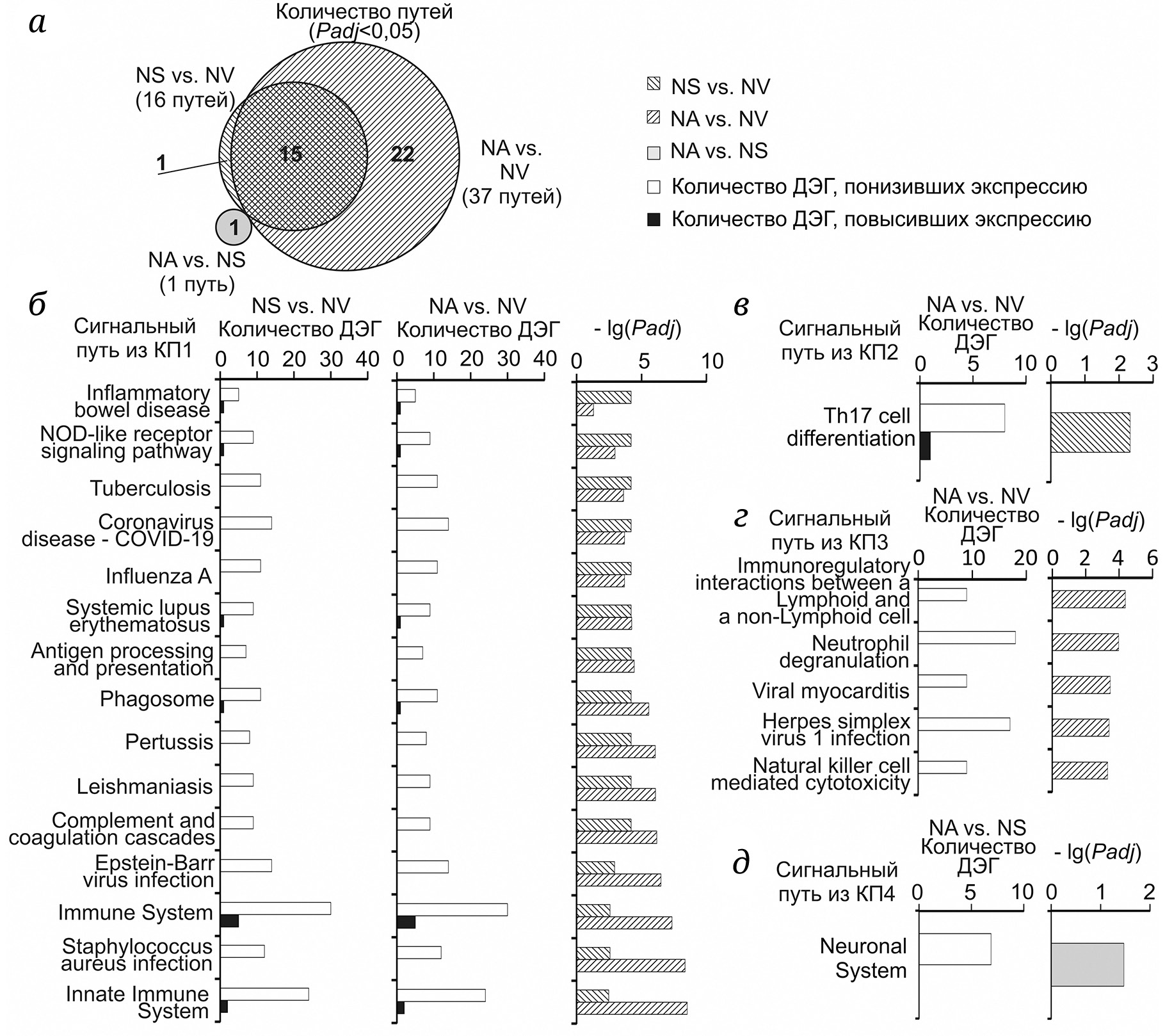 Рис. 5. Сигнальные пути, связанные с влиянием семакса и АКТГ(6–9)PGP на транскриптом участка фронтальной коры крыс. Анализ проводился с помощью программы DAVID v2021. Схематическое сравнение аннотаций (путей), связанных с ДЭГ, полученных в трех парных сравнениях NS vs. NV, NA vs. NV и NA vs. NS в форме диаграммы Венна (а). Количество аннотаций указано цифрами в сегментах диаграммы. Показаны сигнальные пути, лежащие в сегментах на диаграмме Венна: общие для сравнений NS vs. NV и NA vs. NV (б), а также специфичные для сравнений NS vs. NV (в), NA vs. NV (г) и NA vs. NS (д). На панелях (б), (в) и (д) показаны все пути, лежащие в соответствующем сегменте на диаграмме Венна, а на панели (г) – только 5 из 22 путей с минимальной величиной Padj (значение p, скорректированное с использованием процедуры Бенджамини–Хохберга) в NA vs. NV. Для каждого пути представлены значения Padj, а также количество повысивших и понизивших экспрессию генов в соответствующем попарном сравнении. Для анализа были выбраны только ДЭГ и пути с Padj < 0,05. В каждую группу сравнения входило по 3 животных. Inflammatory bowel disease – воспалительное заболевание кишечника; NOD-like receptor signaling pathway – сигнальный путь NOD-подобного рецептора; Tuberculosis – туберкулез; Coronavirus disease – COVID-19 (коронавирусная болезнь); Influenza A – грипп А; Systemic lupus erythematosus – системная красная волчанка; Antigen processing and presentation – обработка и презентация антигена; Phagosome – фагосома; Pertussis – коклюш; Leishmaniasis – лейшманиоз; Complement and coagulation cascades – каскады комплемента и коагуляции; Epstein-Barr virus infection – инфекция вируса Эпштейна–Барр; Immune System – иммунная система; Staphylococcus aureus infection – инфекция золотистого стафилококка; Innate Immune System – врожденная иммунная система); Th17 cell differentiation – дифференцировка клеток T-хелперов 17; Immunoregulatory interactions between a Lymphoid and a non-Lymphoid cell – иммунорегуляторные взаимодействия между лимфоидными и нелимфоидными клетками; Neutrophil degranulation – дегрануляция нейтрофилов; Viral myocarditis – вирусный миокардит; Herpes simplex virus 1 infection – инфекция вируса простого герпеса 1; Natural killer cell mediated cytotoxicity – цитотоксичность, опосредованная естественными клетками-киллерами; Neuronal System – нейронная система