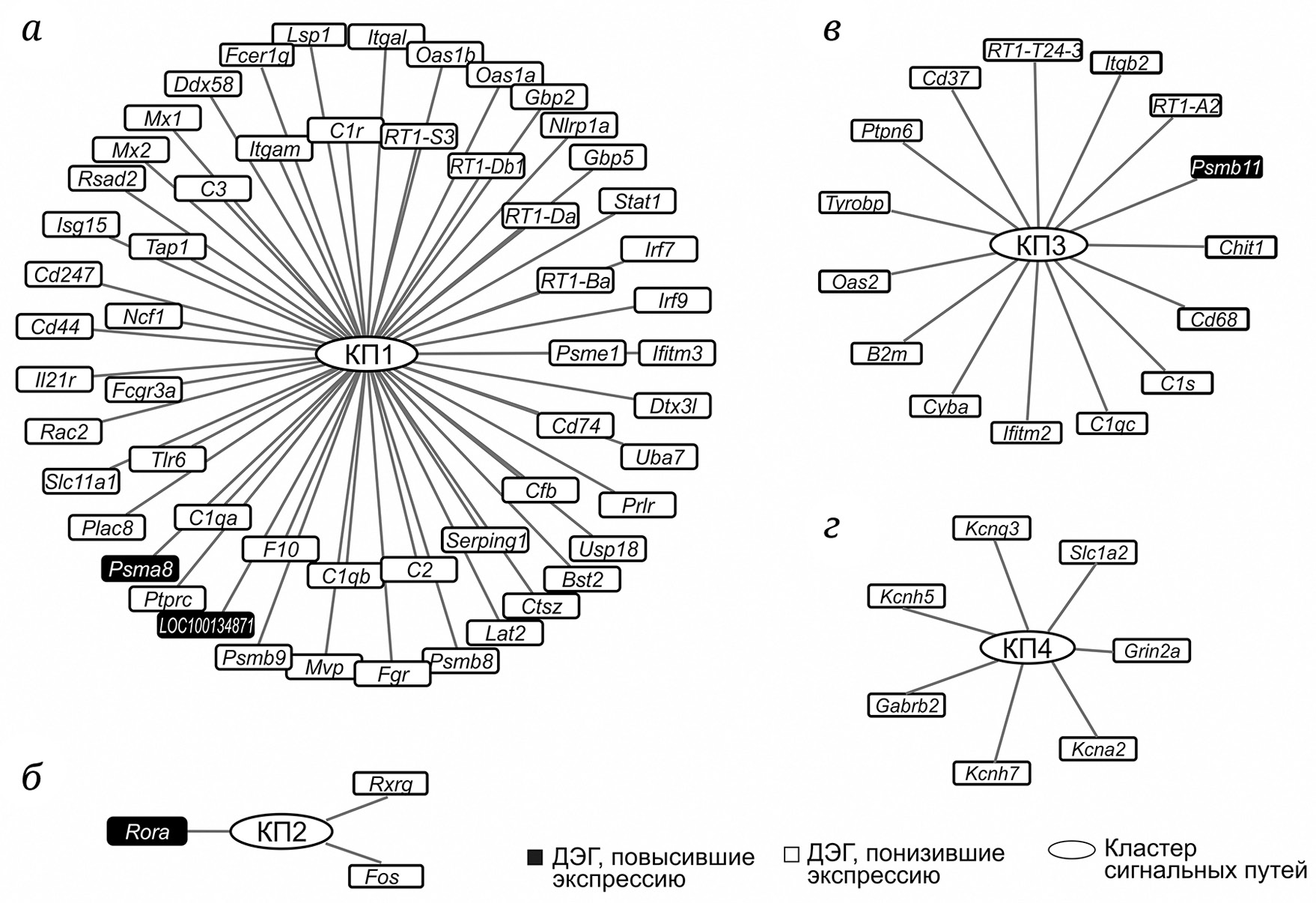 КП1 характеризовал общие эффекты семакса и АКТГ(6–9)PGP (рис. 6, а). В кластер вошли 56 генов, которые изменили экспрессию как под действием семакса, так и АКТГ(6–9)PGP, причем изменение экспрессии этих генов в сравнениях NS vs. NV и NA vs. NV было сонаправлено. Гены преимущественно понизили экспрессию под действием пептидов (рис. 6, а). В сеть, связанную с КП1, вошло большинство генов (Cd247, RT1-Ba, RT1-Da, RT1-Db1, Stat1 и др.), которые кодировали белки, участвующие в презентации путей из нескольких кластеров. Вместе с тем были и гены, связанные только с одним из кластеров путей. Из них было 13 генов (Cfb, F10, Gbp2, Gbp5, Isg15, Lat2, Lsp1, Ncf1, Nlrp1a, Prlr, Tlr6, Usp18), которые участвовали только в презентации путей из КП1.
