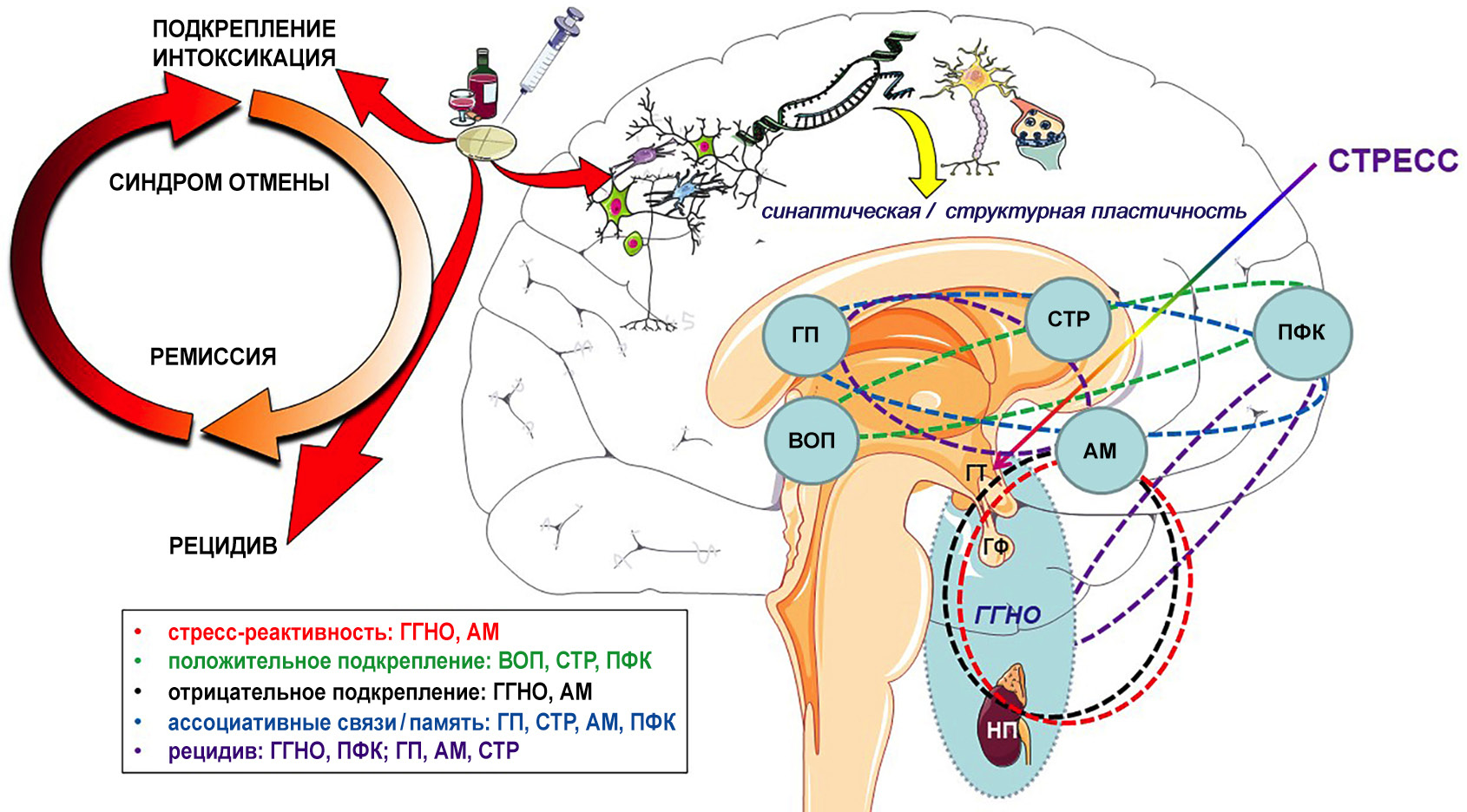 Рис. 1. Участие стресса и нейропластических изменений в формировании порочного круга синдрома патологической зависимости от психоактивных веществ (ПАВ): холистический подход. Развитие зависимости от ПАВ осуществляется на базе фундаментальных механизмов нормального функционирования мозга, включая стресс-реактивность, подкрепление (положительное и отрицательное), обучение и память. Различные ПАВ, наряду со специфическими эффектами, вызывают типовые адаптивные и патологические процессы на молекулярном, клеточном и функциональном уровнях. В процессе формирования зависимости ключевой механизм влияния ПАВ на функционирующую в норме систему положительного подкрепления составляет стимуляция дофаминергических проекций вентральной области покрышки (ВОП) в стриатум (СТР) и действие на префронтальную кору (ПФК). При этом стрессорные факторы, действие которых опосредовано стресс-реактивной гипоталамо-гипофизарной-надпочечниковой осью (ГГНО; ГП – гипоталамус, ГФ – гипофиз, НП – надпочечники) во взаимодействии с ядрами амигдалы (АМ) способствуют добровольной хронической интоксикации, которая становится неконтролируемой. Это сопровождается развитием толерантности к ПАВ и формированием условных ассоциативных связей, при этом включается система ключевых структур в процессах научения и памяти: гиппокамп (ГП), ПФК и AM, которая имеет тесные связи с ГГНО. Прекращение поступления ПАВ при сформированной зависимости сопровождается развитием синдрома отмены (абстинентным синдромом), который, проявляясь на физиологическом и аффективном уровнях, ассоциирован со снижением положительного подкрепления. Абстинентные расстройства становятся новым тяжелым стрессорным фактором, на базе которого формируется отрицательное подкрепление, опосредованное ГГНО и АМ. С дисфункцией ГГНО связано и проявление рецидива, развивающегося на фоне ослабления контроля со стороны ПФК. Реконсолидация памяти – физиологический триггер рецидива, а АМ, ГП и СТР – ключевые структуры. Ассоциированные с развитием зависимости изменения нейропластичности охватывают все уровни, от эпигенетического, молекулярного и синаптического до клеточного и сетевого. Хроническая интоксикация ПАВ приводит как к адаптивным, так и патологическим изменениям экспрессии различных генов, нейрохимическим нарушениям в системах нейромедиаторов и трофических факторов, развитию воспалительного процесса и как результат – структурно-функциональным перестройкам задействованных структур. Следует учесть, что приведенные на рисунке ассоциации структур головного мозга с определенными этапами формирования зависимости достаточно условны и не могут учесть всех известных связей между указанными и другими структурами мозга. Тем не менее, очевидно, что функциональная плейотропность структур мозга, задействованных в процессах стресса, адаптации, обучения и памяти, характерная для здорового мозга, играет важную роль и при формировании зависимости, с одной стороны, обеспечивая процессы адаптации к интоксикации ПАВ, а с другой стороны, формируя патологический фенотип зависимости. В итоге зависимость от ПАВ реализуется на базе фундаментальных физиологических механизмов функционирования мозга, таких как стресс, подкрепление и аверсия, научение и память. В приведенной на этом ри