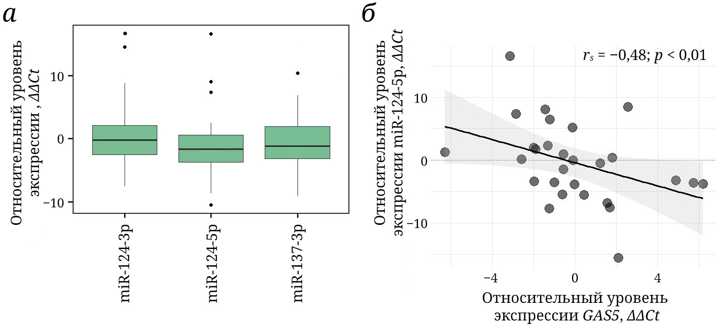Анализ изменений уровня экспрессии миРНК проводили с использованием наборов TaqMan MicroRNA Assays («Thermo Fisher Scientific»): hsa-miR-124-3p (Assay ID: 4427975-001182); hsa-miR-124-5p (Assay ID: 4427975-002197); hsa-miR-137-3p (Assay ID: 4427975-001129) и контрольных наборов TaqMan™ MicroRNA Assays («Thermo Fisher Scientific»): RNU48 (Assay ID: 4427975-001006); RNU6B (Assay ID: 4427975-001093). Исследование уровня экспрессии миРНК выполнено на тотальной выборке из 44 парных образцов РНК.