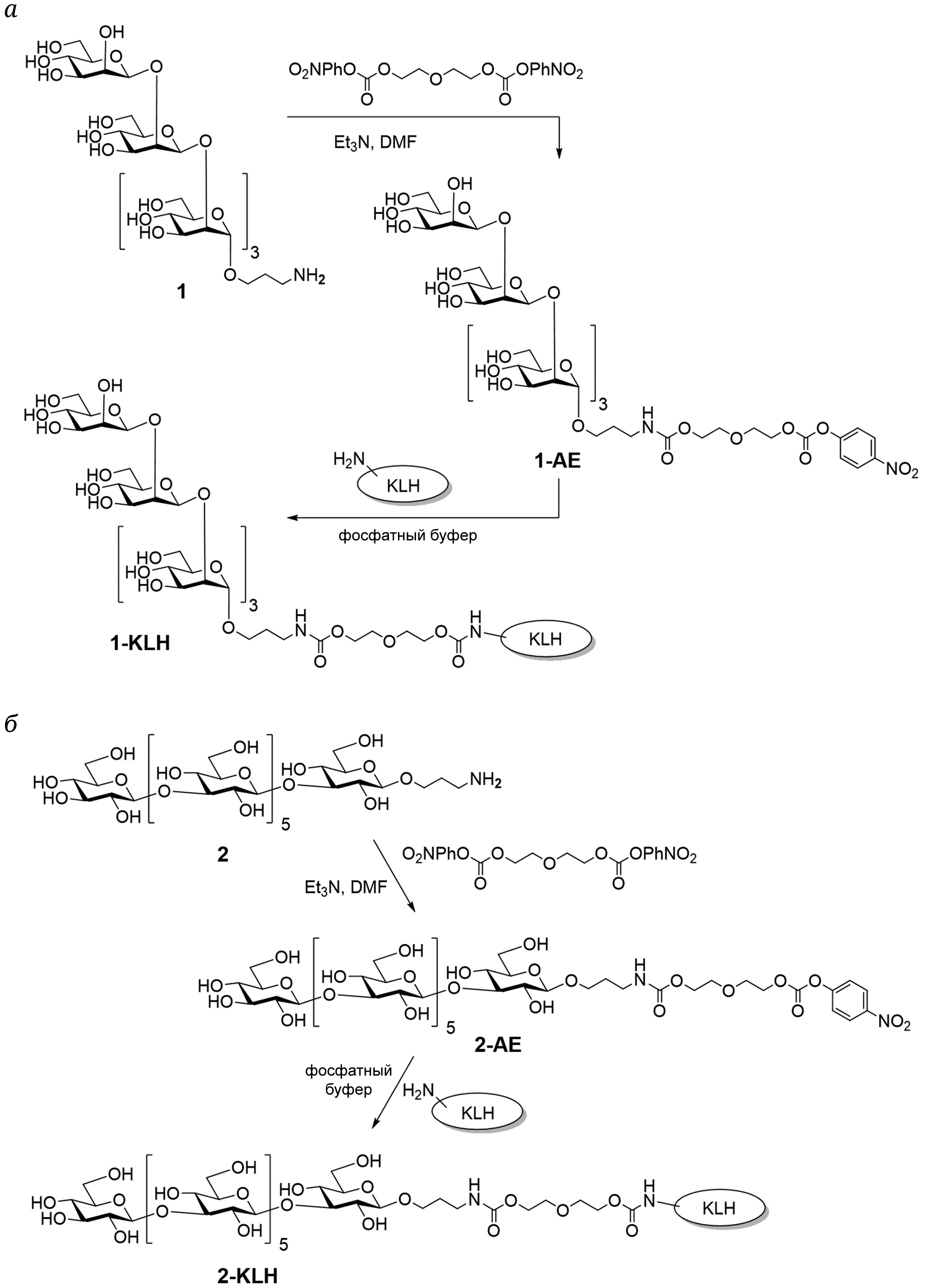 Конъюгаты лигандов 1 и 2 были получены по разработанной ранее методике (схема 1) [33]. Для этого из олигосахаридов 1 и 2, содержащих аминопропильный агликон, были получены производные с дополнительным линкером на основе диэтиленгликоля, содержащим на конце пара-нитрофениловый эфир (соединения 1-АЕ и 2-АЕ соответственно). Активированные таким образом лиганды 1-АЕ и 2-АЕ были введены в реакцию с белком-носителем с дальнейшей очисткой с помощью диализа. Таким образом, были получены конъюгаты 1-KLH и 2-КLH, содержащие фрагменты целевых грибковых антигенов – маннана и глюкана.
