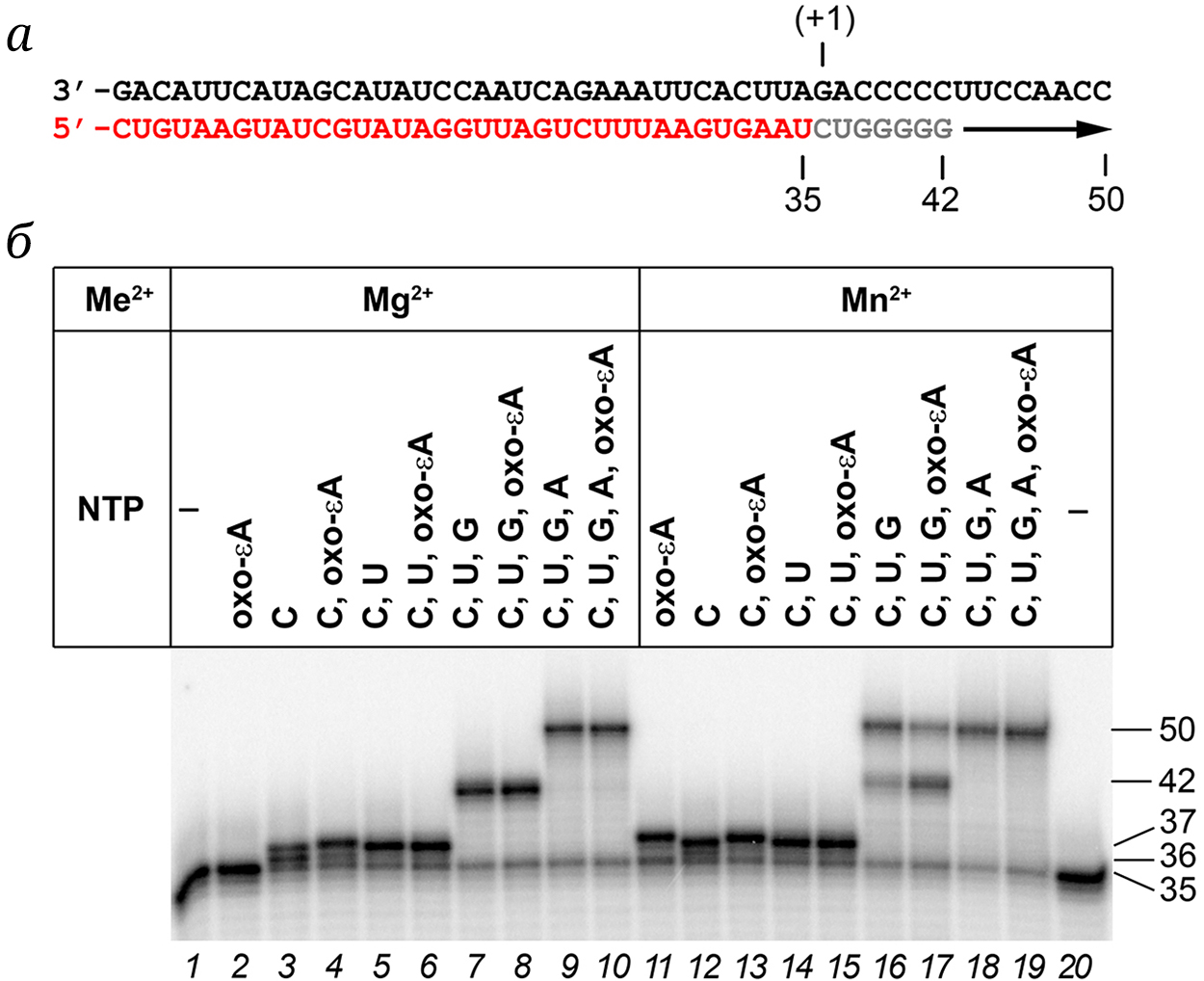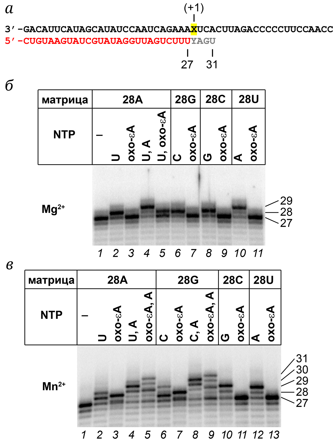 Путём добавления различного набора NTP можно установить эффективность включения тестируемого соединения напротив разных матричных азотистых оснований. В +1 положении матрицы находится остаток G (рис. 2, а). Добавление только oxo-εATP в присутствии ионов Mg2+ не приводит к удлинению РНК-праймера (дор. 2). В контрольном опыте при добавлении CTP (дор. 3) большая часть праймера удлиняется на 1–2 нуклеотида (вероятно, за счёт включения СТР напротив остатков G и А, что соответствует опубликованным данным о достаточно низкой точности RdRp SARS-CoV-2 [5]). В присутствии ионов Mn2+ RdRp приобретает способность включать два остатка oxo-εA напротив остатков G и A в РНК-матрице (дор. 11) и также включает два остатка С напротив G и А (дор. 12).