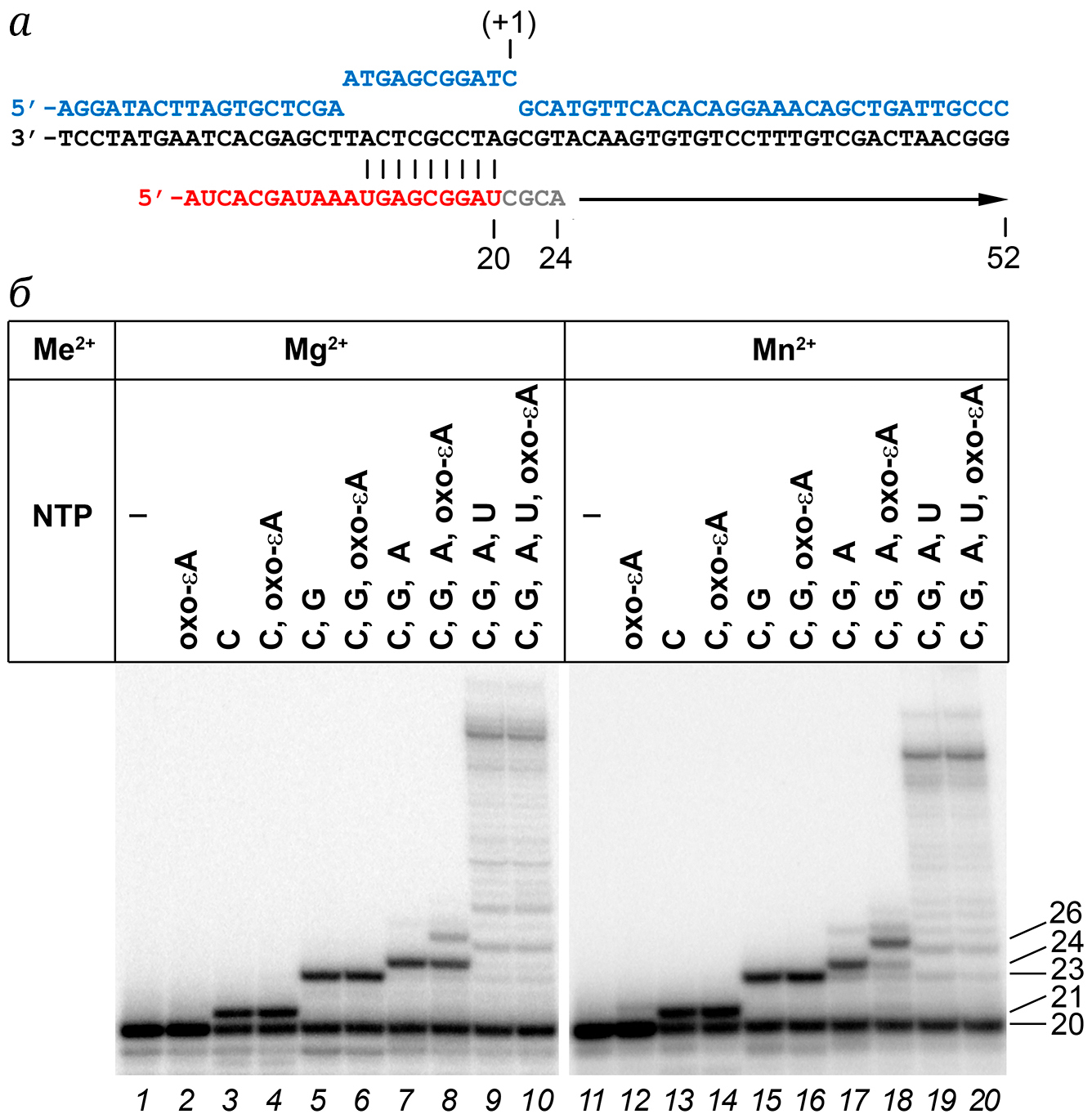 Рис. 4. Анализ включения oxo-εATP РНКП E. coli. а – Схема элонгационного комплекса, использованного в экспериментах. РНК-олигонуклеотид показан красным цветом, матричная цепь ДНК – чёрным цветом, нематричная цепь – синим. Показана точка начала включения нуклеотидных остатков (+1), первые 4 включённых нуклеотидных остатка отмечены серым цветом, направление транскрипции указано стрелкой. б – Анализ продуктов транскрипции в присутствии разных наборов NTP и oxo-εATP при добавлении ионов Mg2+ (левая панель) и Mn2+ (правая панель). Контрольные образцы, которые инкубировали без NTP, отмечены знаком «−». Электрофореграмма продуктов транскрипции в 15%-ном ПААГ в денатурирующих условиях. Справа отмечена длина РНК-продуктов в нуклеотидах