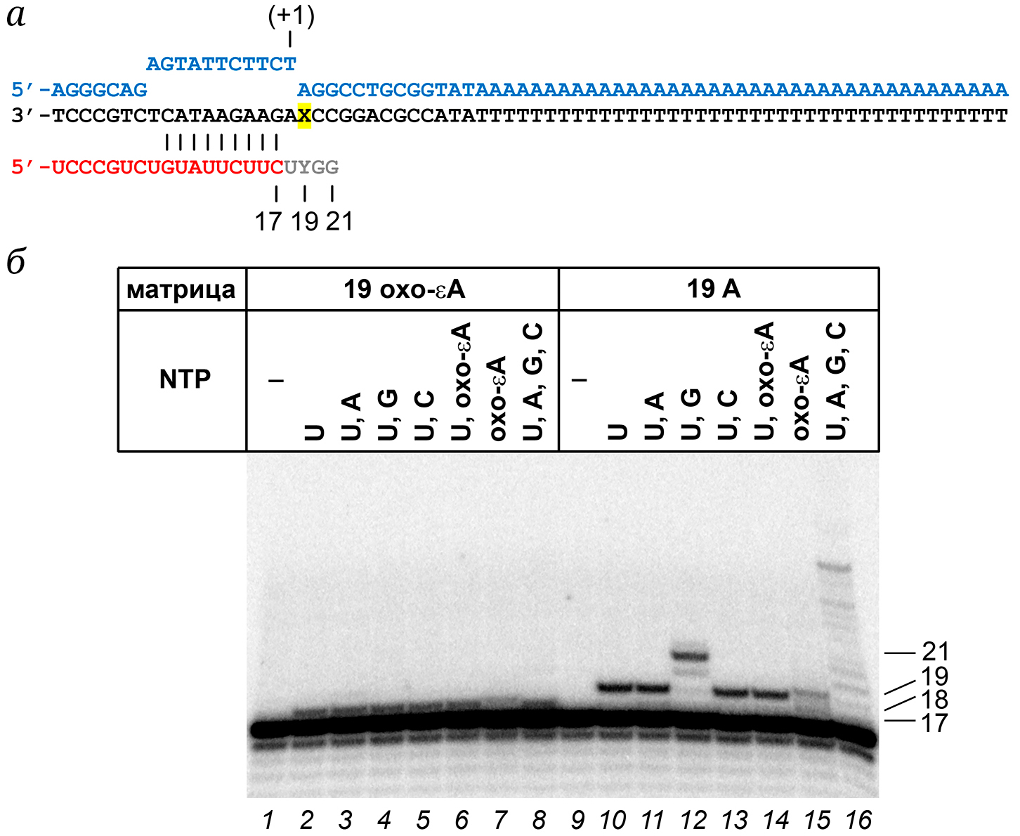 Включение NTP напротив oxo-εA 2′-дезоксирибонуклеотида РНКП. На заключительном этапе нашего исследования мы протестировали противоположную ситуацию, когда модифицированный остаток oxo-εA находится в матричной цепи ДНК, а синтез РНК клеточной РНКП происходит с использованием немодифицированных NTP. Для этого по аналогии с предыдущим пунктом были собраны синтетические элонгационные комплексы, содержащие остаток oxo-εA 2′-дезоксирибонуклеотида в +2 положении матричной цепи ДНК относительно 3′-конца РНК-праймера (в +1 положении при этом находится остаток dА; рис. 5, а). В качестве контроля использовали ДНК-олигонуклеотид, содержащий немодифицированный остаток dA в +2 положении. В случае контрольной матрицы РНКП добавляет в растущую цепь РНК комплементарные NTP: UTP (происходит удлинение 17 нт РНК на 2 нт, до 19 нт; рис. 5, б, дор. 10), UTP и GTP (удлинение на 4 нт, до 21 нт; дор. 12) или все четыре NTP (дор. 16). В соответствии с предыдущими экспериментами также наблюдается слабое включение oxo-εATP напротив матричного dА (дор. 15). В случае элонгационного комплекса, содержащего oxo-εA в +2 положении матричной цепи ДНК, во всех реакциях наблюдается включение лишь первого остатка UTP напротив матричного dА, после чего синтез останавливается и дальнейшего включения NTP напротив oxo-εA не происходит (рис. 5, в, дор. 2–8).