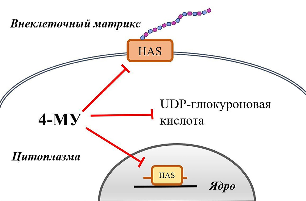 4-МУ оказывает действие на такие связанные с прогрессией опухоли процессы, как миграция, пролиферация, инвазия раковых клеток и ангиогенез. Клетки микроокружения опухоли, представленные эндотелиальными клетками, клетками иммунной системы и фибробластами, также испытывают влияние 4-МУ. Все эти процессы сопряжены с активными изменениями в строении и составе межклеточного матрикса, основным компонентом которого является ГК. Эти работы обосновывают разработку лекарств, направленных на изменение свойств межклеточного матрикса. Такой подход является многообещающим в лечении различных видов рака, а 4-МУ представляет собой уже допущенный к применению препарат, который может быть использован в новом качестве.
