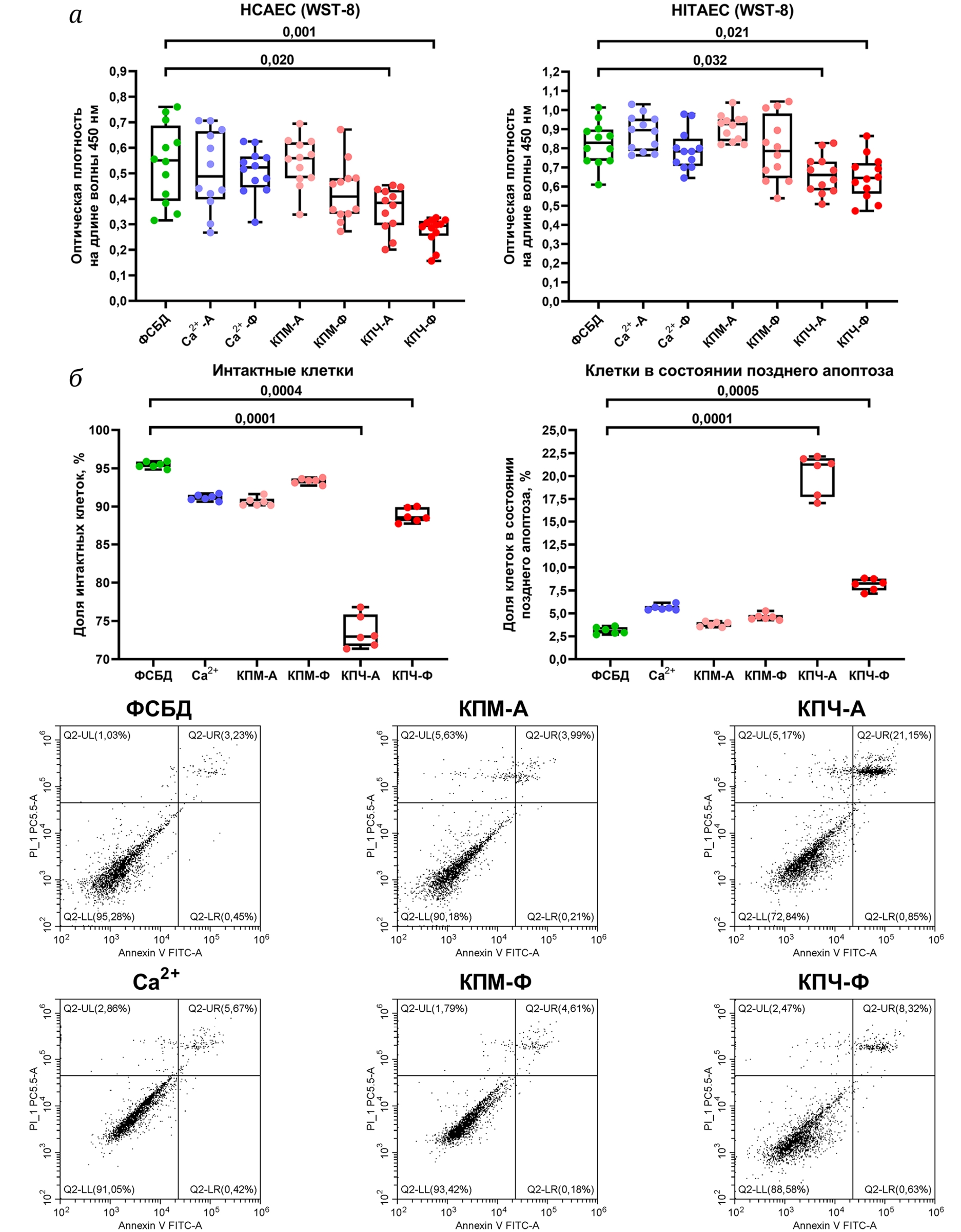 Рис. 5. Тест на цитотоксичность после инкубации HCAEC (левые панели) и HITAEC (правые панели) с ФСБД (контроль), свободными ионами Ca2+ (Ca2+-А или Ca2+-Ф), КПМ (КПМ-А или КПМ-Ф) или КПЧ (КПЧ-А или КПЧ-Ф) (10 мкг кальция на 1 мл бессывороточной культуральной среды) в течение 24 ч. а – Колориметрический тест WST-8 (оценка восстановления WST-8 внутриклеточными дегидрогеназами до водорастворимого оранжево-жёлтого формазана, максимальная абсорбция которого наблюдается при 450 нм). б – Тест с аннексином V и пропидия йодидом (нижний левый квадрант Q2-LL – нормальные клетки; нижний правый квадрант Q2-LR – клетки в состоянии раннего апоптоза; верхний правый квадрант Q2-UR – клетки в состоянии позднего апоптоза; верхний левый квадрант Q2-UL – клетки в состоянии некроза). Верхняя панель – статистический анализ содержания интактных клеток и клеток в состоянии позднего апоптоза. Нижняя панель – репрезентативные проточно-цитометрические графики. Значения вероятности отклонить верную нулевую гипотезу (p) при межгрупповом сравнении указаны над графиками