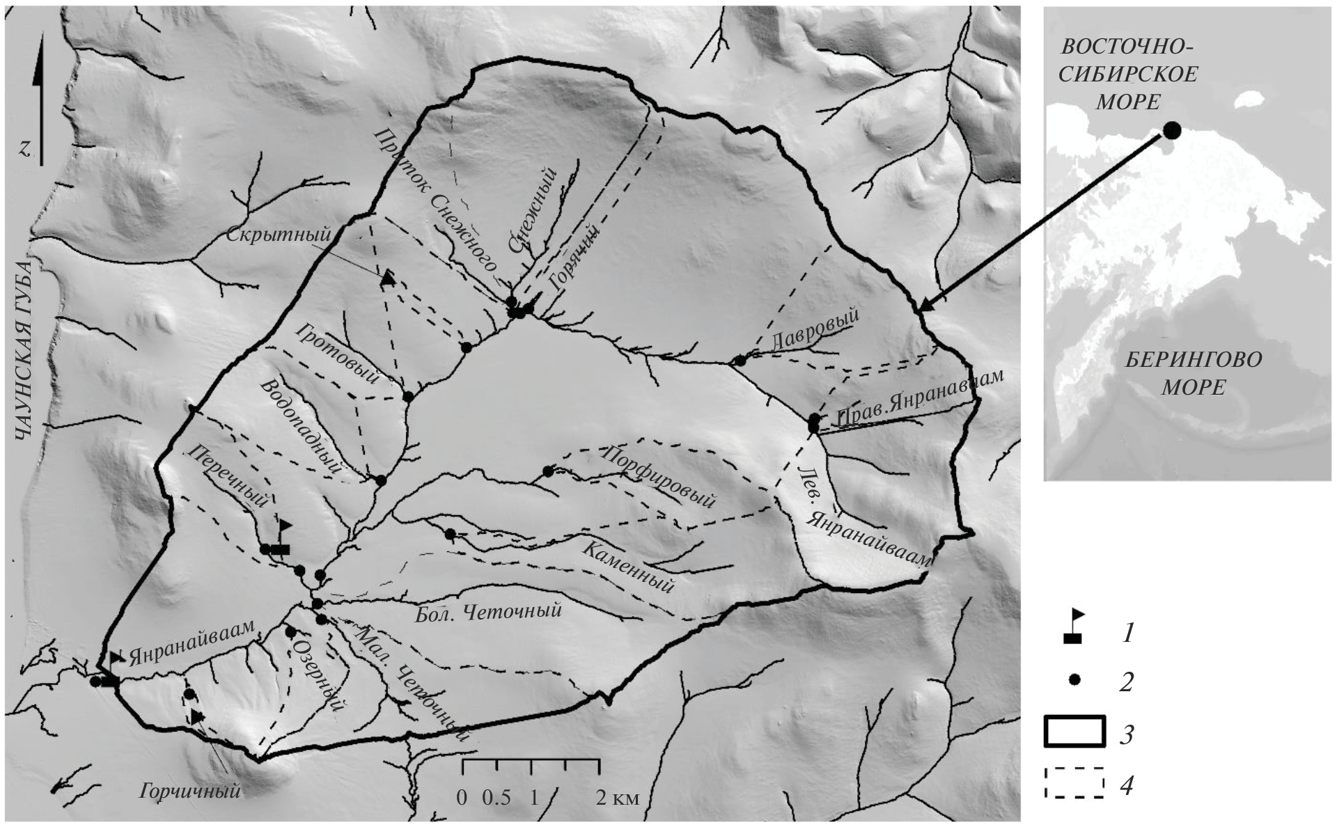 Приведены результаты обобщения краткосрочной экспедиционной гидролого-гидрохимической съемкив арктическом речном бассейне в северо-восточной части Чаунской низменности в северной части Чукотки, выполненной в июле 2020 г. В масштабе малого речного бассейна р. Янранайваам проанализирована структура водных масс, выявлены водосборы отдельных притоков с интенсивным развитием криогенных процессов, что находит отражение в их химическом составе воды, а именно – в повышенном содержании гидрокарбонат-ионов, растворенного железа и растворенного органического углерода. С использованием двухтрассерной модели смешения на момент съемки определены и оценены доли источников питания, а также их пространственные соотношения. Основные источниками питания – атмосферные воды (преимущественно от снеготаяния), склоновые почвенные воды сезонно-талого слоя, талые воды гольцовых льдов. В водосборах средней и верхней частей бассейна преобладающий источник – атмосферная вода (67–78%), а в водосборах нижней части бассейна – почвенные воды сезонно-талого слоя (59–64%). Питание рек водами от таяния гольцовых льдов – типично для всего бассейна и в верховьях реки на момент съемки составляет 10–14%.