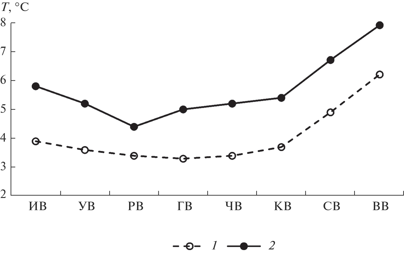Рассмотрены изменения температуры воздуха в бассейне волжских водохранилищ, общего притока в водоемы, их водообмена, уровня, температуры воды и теплосодержания водной массы в период открытой воды в разных климатических условиях. Для анализа использованы многолетние ряды гидрометеорологических данных, обработанные статистическими методами. Показано, что в современный период по сравнению с периодом до 1976 г. температура воздуха на побережье водохранилищ увеличилась на 1.3‒1.8°С. Скорость потепления составила в среднем 0.50°С/10 лет. Объем годового притока увеличился на 12.4%. На водохранилищах верхнего участка Волги выделено 3 маловодных и 4 многоводных фазы, которые включают 29‒31 маловодных, 25‒31 многоводных и 8‒16 средних по водности лет. В маловодные фазы объем притока в водохранилища на 10‒28% ниже среднего многолетнего, а в многоводные ‒ выше на 4‒20%. Коэффициент водообмена водохранилищ уменьшался или увеличивался на 5−13% относительно полученных ранее величин. На водохранилищах верхнего участка Волги и на Куйбышевском водохранилище отмечено увеличение зимнего и снижение весеннего притока. В современный период отмечена тенденция повышения среднегодового уровня воды на водохранилищах верхнего участка Волги и на Куйбышевском водохранилище, тогда как на Нижней Волге среднегодовой уровень несколько понизился. В маловодные фазы уровень водохранилищ в среднем был ниже на 17 см, а в многоводные – выше на 10 см среднего многолетнего. Повышение температуры воздуха в течение теплого сезона в пределах акватории водохранилищ в среднем на 1.2°С привело к синхронному повышению температуры водной массы на 1.1°С. При этом теплосодержание водной массы водохранилищ верхнего участка Волги увеличилось в среднем на 24%, а на нижнем участке Волги ‒ всего на 2‒11%.
