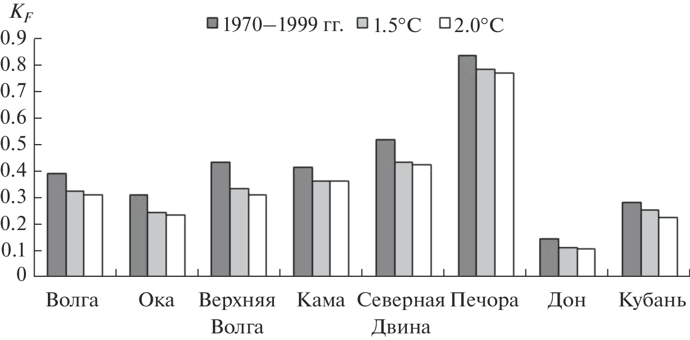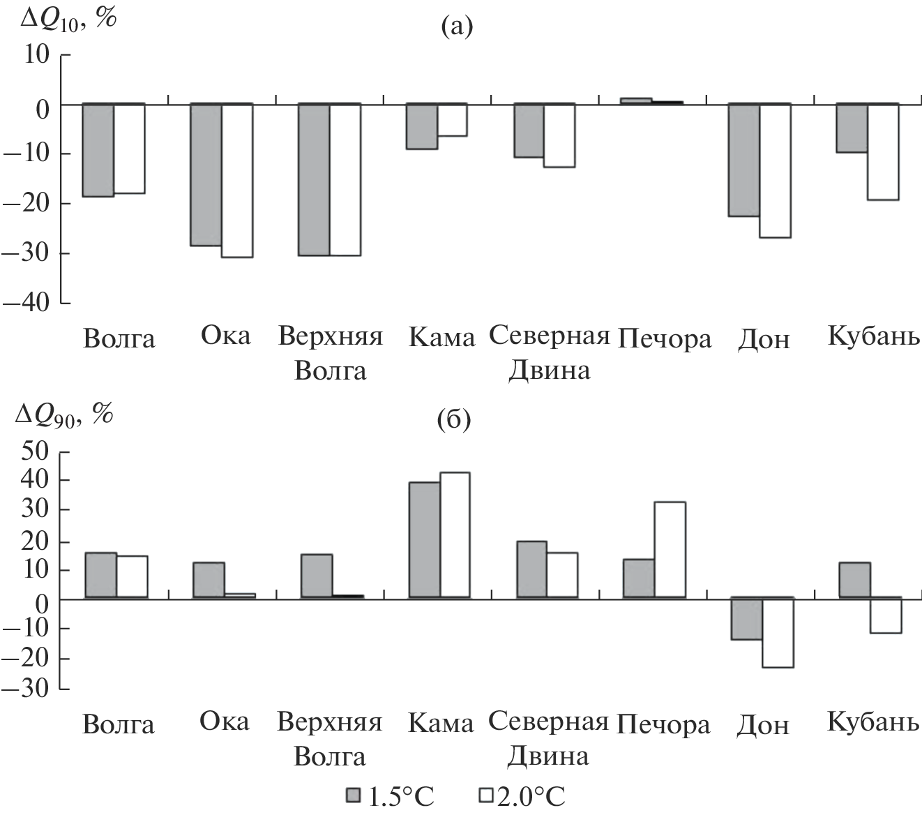 The ECOMAG hydrological model was used to evaluate runoff characteristics in the basins of the major rivers in European Russia: the Volga, Don, Northern Dvina, Pechora, and Kuban. The models of runoff formation for various hydrometric gauging stations in these basins were calibrated using data of weather station observations. Next, the input data were represented by the data of an ensemble of global climate models for assessing the regional hydrometeorological regime at the realization of a scenario of global warming by 1.5 and 2°C in the XXI century relative to the preindustrial values. The reproduction of the annual and seasonal runoff by data of climatic models was evaluated by comparison with observation data. According to the results of numerical experiments at global warming by 1.5 and 2°C, the values of the relative changes in river runoff in European Russia increase from N to S and from E to W, i.e., the hydrological systems under milder climate were found to be more sensitive to changes in the meteorological characteristics. The estimation of runoff anomalies in the European Russia showed the following common features: an increase in the winter runoff in the northern rivers and in the Volga basin, a decrease in the spring snowmelt runoff in the Northern Dvina, Volga, and Don, a decrease in the summer–autumn runoff of all studied rivers with various intensity. In this case, the annual runoff of the Pechora will show a positive trend, and that of the Northern Dvina, Volga, Don, and Kuban, a negative trend.