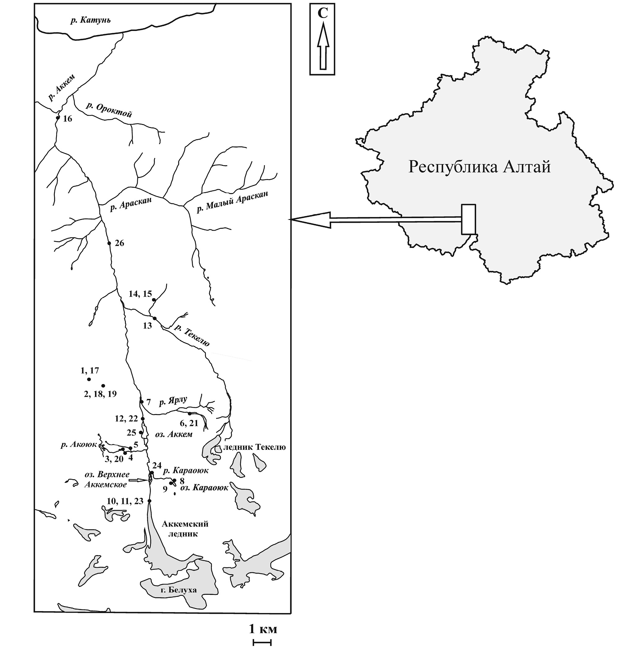 Бассейн р. Аккем занимает восточную часть природного парка “Белуха” и расположен в Катунском физико-географическом районе Центрально-Алтайской провинции (рис. 1). Административно относится к Усть-Коксинскому району Республики Алтай, с юга граничит с Рес публикой Казахстан. Здесь расположена наиболее высокогорная и труднодоступная часть парка. В орографическом отношении основная часть бассейна расположена на северном макросклоне восточного фланга Катунского хребта [9]. Рельеф территории бассейна р. Аккем типично горный, в южной его части – альпийский. Климат резко континентальный (особенно суровый в верхней части долины, у подножья г. Белухи – 4509 м) с низкой среднегодовой температурой и высококонтрастным тепловым режимом на разных высотах. Аккемская озерная экосистема представлена проточными озерами с крутосклонными скалисто-осыпными и заболоченными ландшафтами [9, 19].