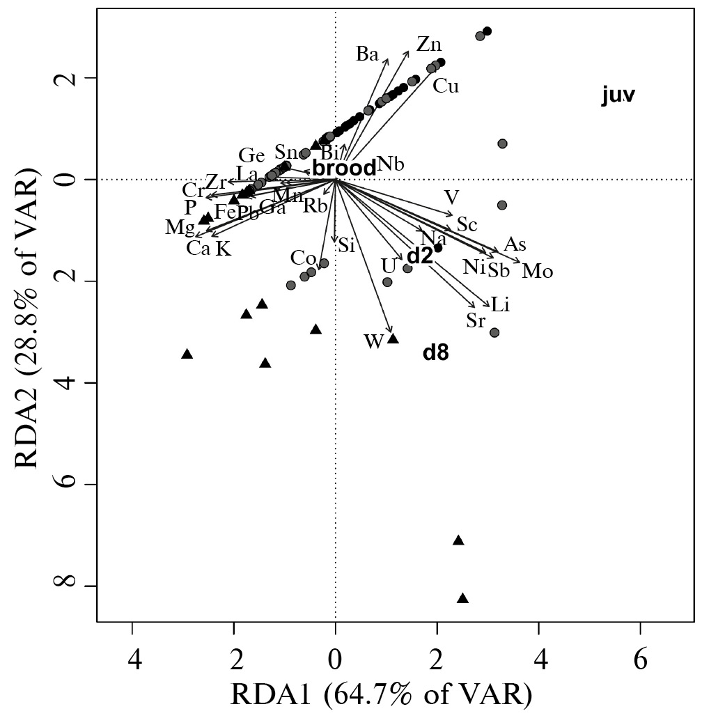 Рис. 1. Ординационная диаграмма анализа избыточности (RDA). Серые векторы – металлы; метки d2, d8, brood и juv – показатели биотестирования; черный круг – токсичные пробы, обладающие стимулирующим эффектом по показателю плодовитости; черный треугольник – токсичные пробы, обладающие эффектом угнетения; серый круг – нетоксичные пробы.