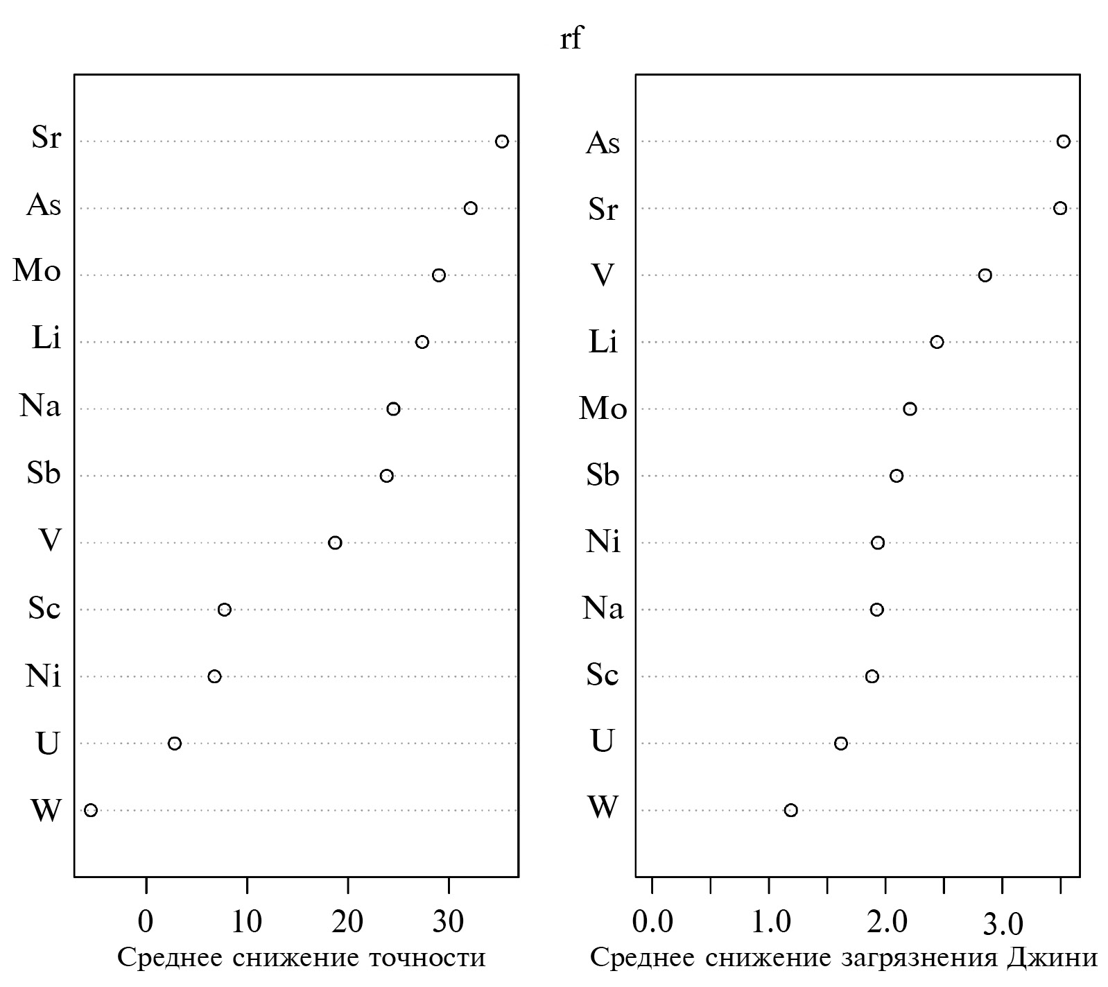 Методом случайного леса был оценен вклад каждого металла в токсичность среды (рис. 3). Наибольший вклад вносят Sr, Li и As. Заметный вклад в токсичность вносят Sb, Mo и V. Концентрации перечисленных элементов связаны между собой сильными положительными корреляционными связями, коэффициент корреляции >0.6. Меньший вклад в токсичность среды вносят W, Sc, U и Ni.