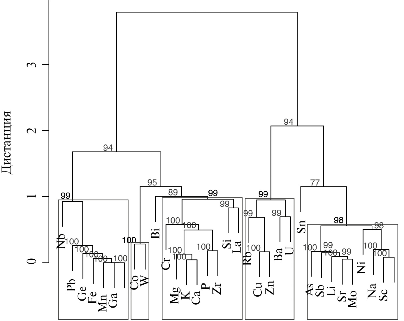 Рис. 4. Иерархическая кластеризация содержания химических элементов в пробах.
