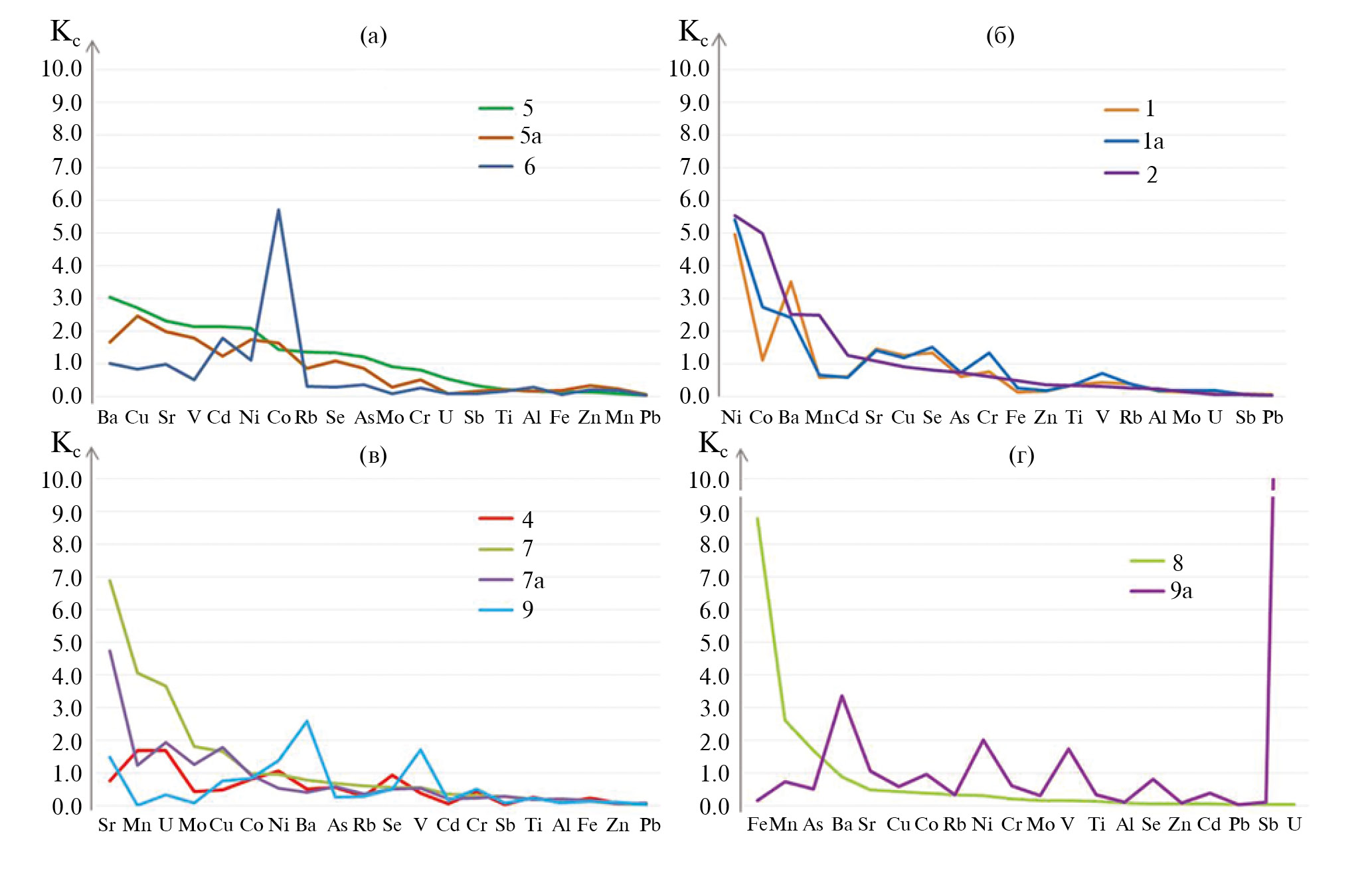Содержания большинства изученных микроэлементов (табл. 4) находятся на уровне, характерном для подземных вод зоны выщелачивания умеренного климата [23]. Значимые превышения (>2 раз) отмечены для Ba (родники 1, 1а, 2, 5, 9, 9а), Cd (родник 5), Co (родники 1а, 2, 6), Cu (родник 5 и 5а), Fe (родник 8), Mn (родники 2, 4, 7, 8), Ni (родники 1, 1а, 2, 5, 9а), Sr (родники 5, 7, 7а), U (родники 7 и 9а), V (родник 5).
