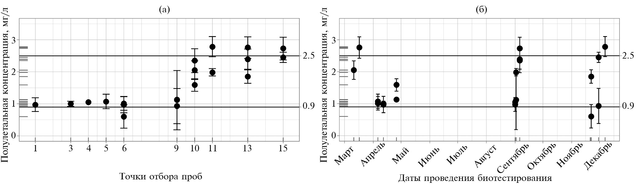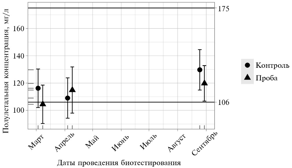 Чувствительность дафний и рыб оценивали по величине ЛК50 (полулетальной концентрации) модельного токсиканта бихромата калия (K2Cr2O7), чувствительность водорослей оценивали по величине ЭК50 (полуэффективной концентрации) модельного токсиканта. Нормативный диапазон чувствительности к бихромату калия для водорослей составляет 1.3–2.5 мг/дм3 за 48 ч, для дафний 0.9–2.5 мг/дм3 за 24 ч и для рыб 106.0–175.0 мг/дм3 за 24 ч [4].