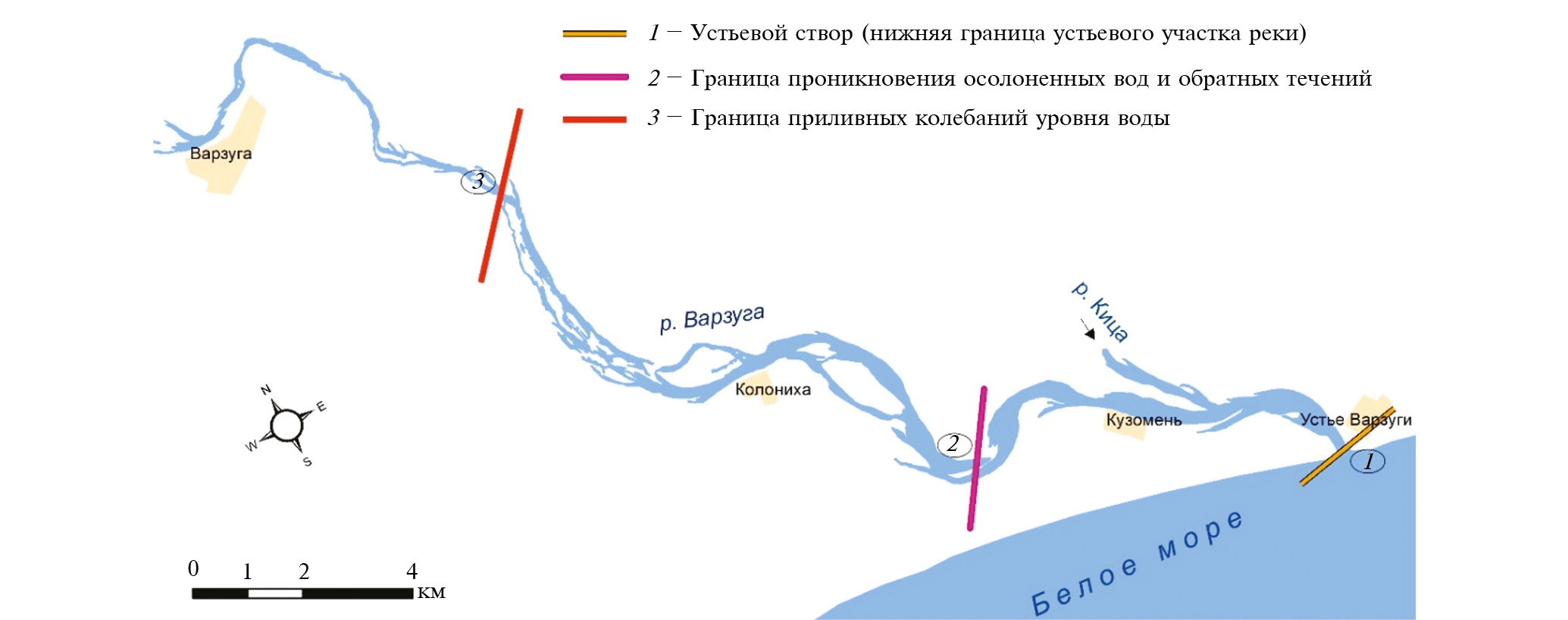 По результатам экспедиции в нижнем течении р. Варзуги в зимнее время можно выделить три гидрологических участка (рис. 5). На первом (27–20 км от устья) участке гидрологические условия соответствуют речным (выше границы 3 на рис. 5 – зимой здесь не выявлены приливные колебания уровня). На втором участке (20–8 км от устья) вода всегда пресная, но заметны полусуточные приливные изменения уровня воды. Скорее всего, здесь есть и соответствующие колебания скорости течения: в прилив она уменьшается, а в отлив увеличивается. На третьем участке (8–0 км) все основные гидрологические характеристики (уровень, температура, соленость, скорость и направление течения воды) имеют выраженную полусуточную приливную изменчивость (между границами 1 и 2 на рис. 5). Гидрологические условия здесь колеблются в широких пределах: от речных (на минимуме отлива) до морских (на максимуме прилива).