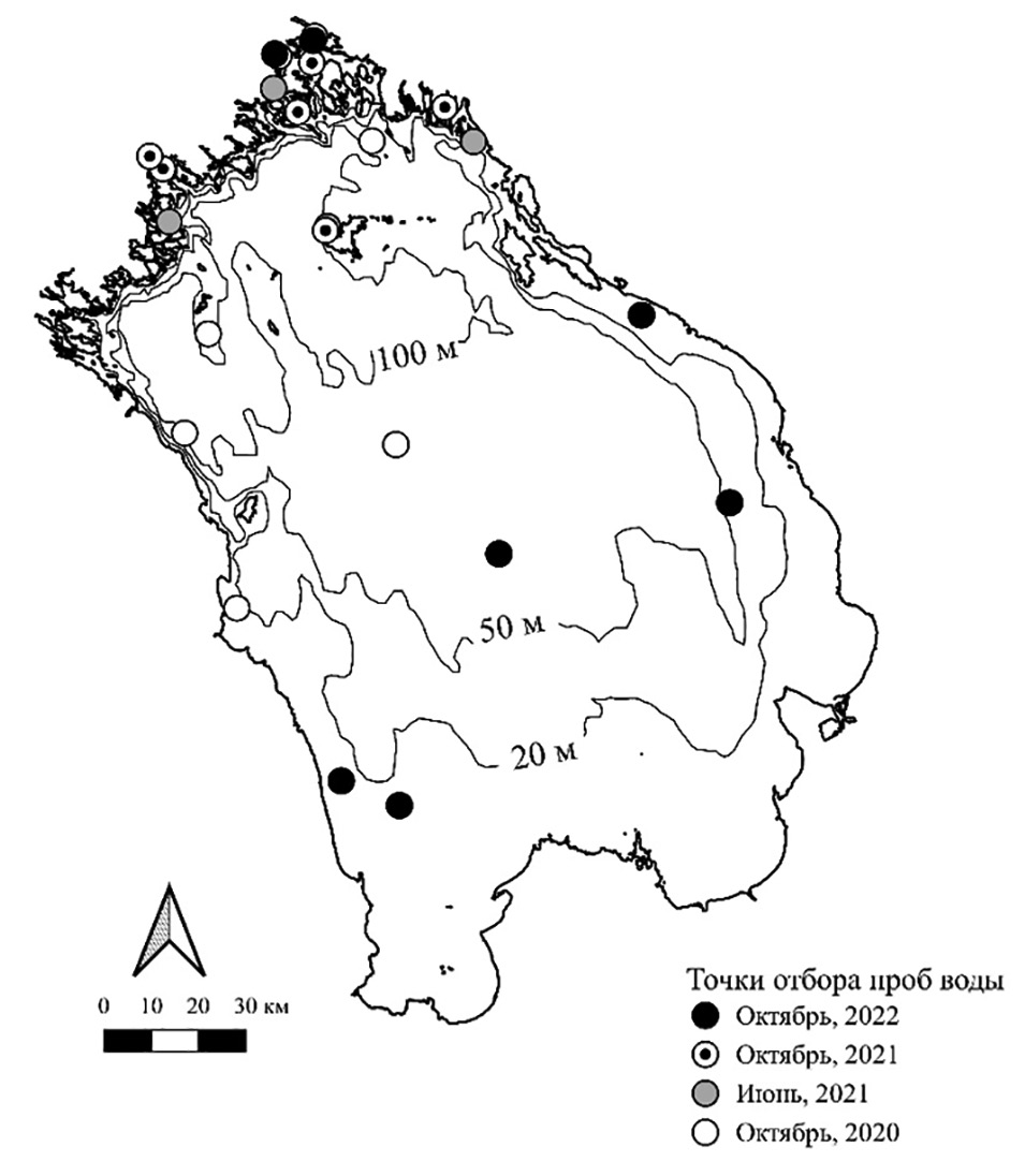 Пробы отбирались в 2020−2022 гг. в весенний (июнь) и осенний (октябрь) гидрологические сезоны, когда в озере меньше взвеси, препятствующей фильтрации большого объема воды и, следовательно, способствующей понижению точности измерений. Отобрано 140 проб в 25 точках на различных водных горизонтах: 0, 5, 10, 15, 30, 35, 45, 50, 65, 70 м в зависимости от глубины озера в точке отбора и от вертикального распределения температуры воды. При наличии слоя температурного скачка пробы отбирались в поверхностном слое, на верхней границе слоя скачка или внутри него, а также под ним. При гомотермии пробы отбирались по всему столбу воды на разных горизонтах. Глубины озера в точках отбора были от 15 м (в южной и западной части) до 80–100 м (в северной части). В шхерных районах северной части Ладоги глубины озера в точках отбора были от 10 до 53 м (рис. 1). Объем проб составлял 100−1000 л, в периоды наличия большого количества фитопланктона прокачивалось меньшее количество литров в связи с забиванием фильтра взвесью. При малом объеме пробы в одной точке (до 500 л) пробы отбирались в двух-трех повторностях.