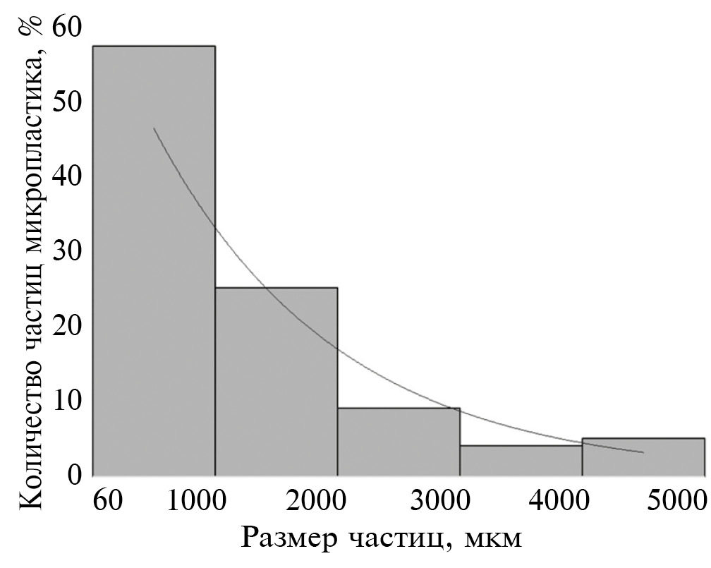 Большая часть анализируемых частиц микропластика имела размер в диапазоне от 60 до 1000 мкм (57%) (рис. 2). Количество частиц увеличивается с уменьшением их размера.