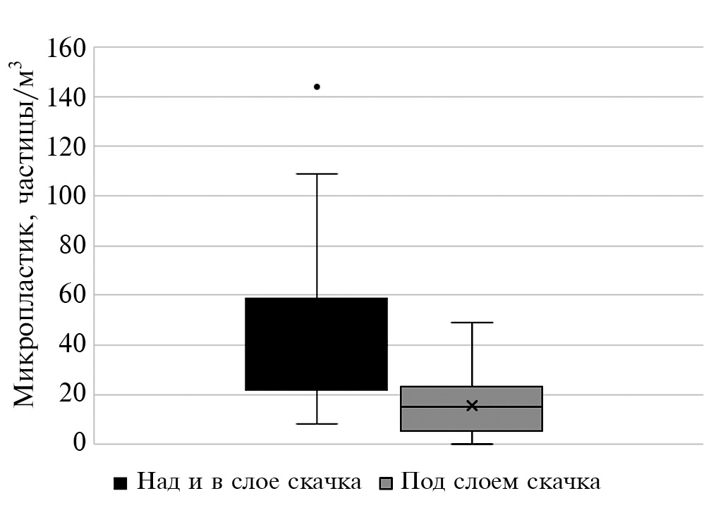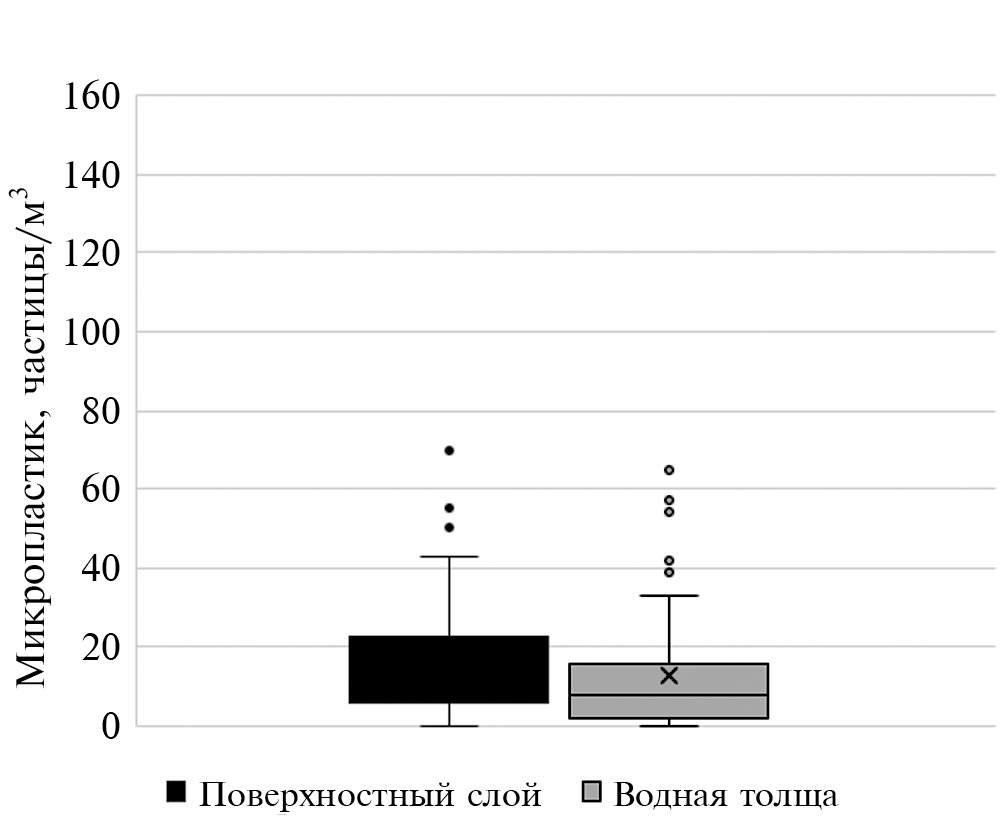 Среднее содержание микропластика в поверхностном слое (0–5 м) составило 26±29.6, в водной толще – 14±15.1 частиц/м3. U-критерий Манна–Уитни показал существенные различия между концентрациями микропластика в поверхностном слое и водной толще (p = 0.02302).