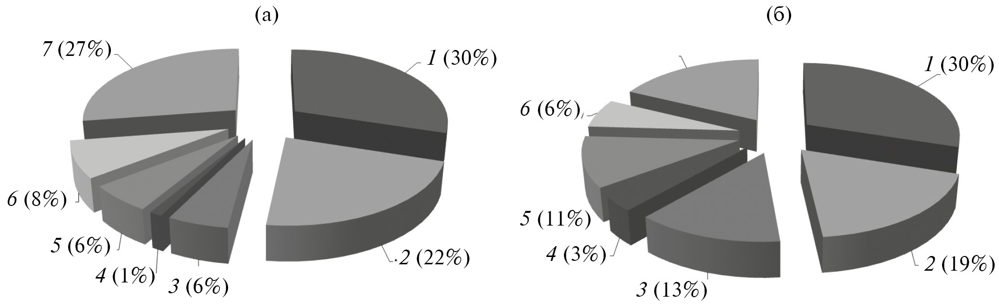 4. Fig. 3. Fractional contribution of phosphorus (a) and nitrogen (b) discharge from the studied sub-basins to the total load on Lake Onega in 2021 (year of average water availability): 1 - Vodla River, 2 - Shuya River, 3 - Suna River, 4 - western tributaries, 5 - Zaonezhye River, 6 - eastern tributaries, 7 - southern tributaries